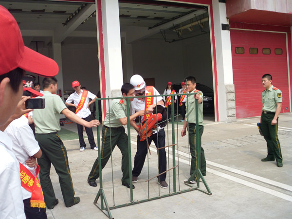 消防大队官兵首先带领志愿者参观了消防器材装备库,详细介绍了相关灭火、救援器材和装备的作用、使用范围及方法,并对部分装备进行了现场展示。随后,消防志愿者们亲身体验了对部分装备器材的使用,如消防战斗服、空气呼吸器、切割机等。志愿者们纷纷感觉背在身上的装备很重,但感觉更重的还是责任。