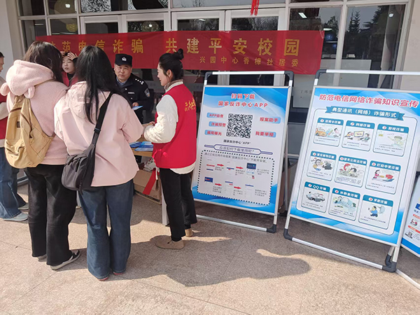 活动以展板、条幅、现场讲述、发放警示纪念礼品的形式展现。社区志愿者和民警同志为同学们讲述了电诈的类型,电诈的危害程度,电诈的防范措施等。现场气氛热烈,同学们互动积极。