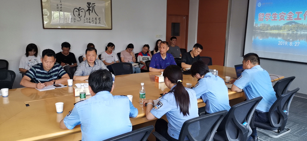 本网讯 (通讯员:仇陶)按照学校相关工作安排,结合bat365留学生和外教管理的现状,8月27日上午,留学生安全工作座谈会在国教院二楼会议室召开,公安高新分局治安大队、国保大队、高新派出所的分管领导和干警,国教院院长徐鸣、留学生管理人员和保卫处有关人员参加会议。会议由保卫处副处长仇陶主持。