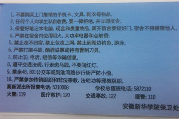 由于考虑到新生大多都是第一次远离家门,安全防范意识相对较薄弱,所以校保卫处特意制作贴心小卡片,送至每位新生手上,以加强新生的安全意识。在军训期间,校保卫处还将开展安全教育课、消防应急疏散演练等活动。