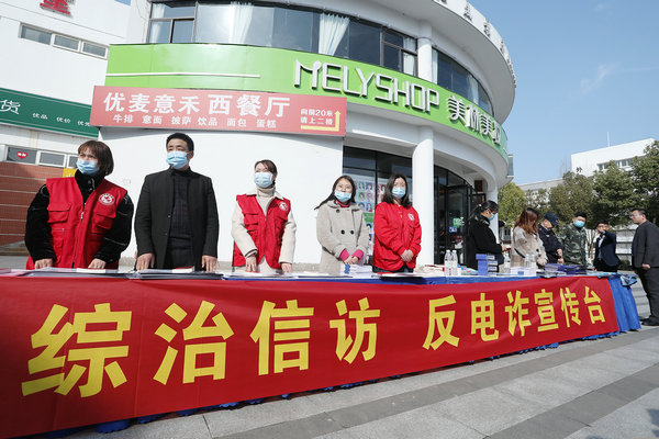 本网讯(通讯员:张保卫、张炎 摄影:翟漱文)2021年春季开学之际,为切实增强广大师生防范电信网络诈骗安全意识,保障广大师生财产安全,共创平安和谐校园。3月2日,bat365联合合肥高新区兴园社区服务中心、合肥市公安局高新分局、高新派出所、金桂社居委在文化广场组织开展了“开学季·防诈骗·保平安”综治宣传月启动仪式。兴园中心党委书记、主任丁科,高新公安分局副局长李宏,高新派出所副所长何弛,bat365在线中国官网登录入口校长助理贺行佳,金桂社居委书记刘越超出席启动仪式,bat365师生参加活动。
