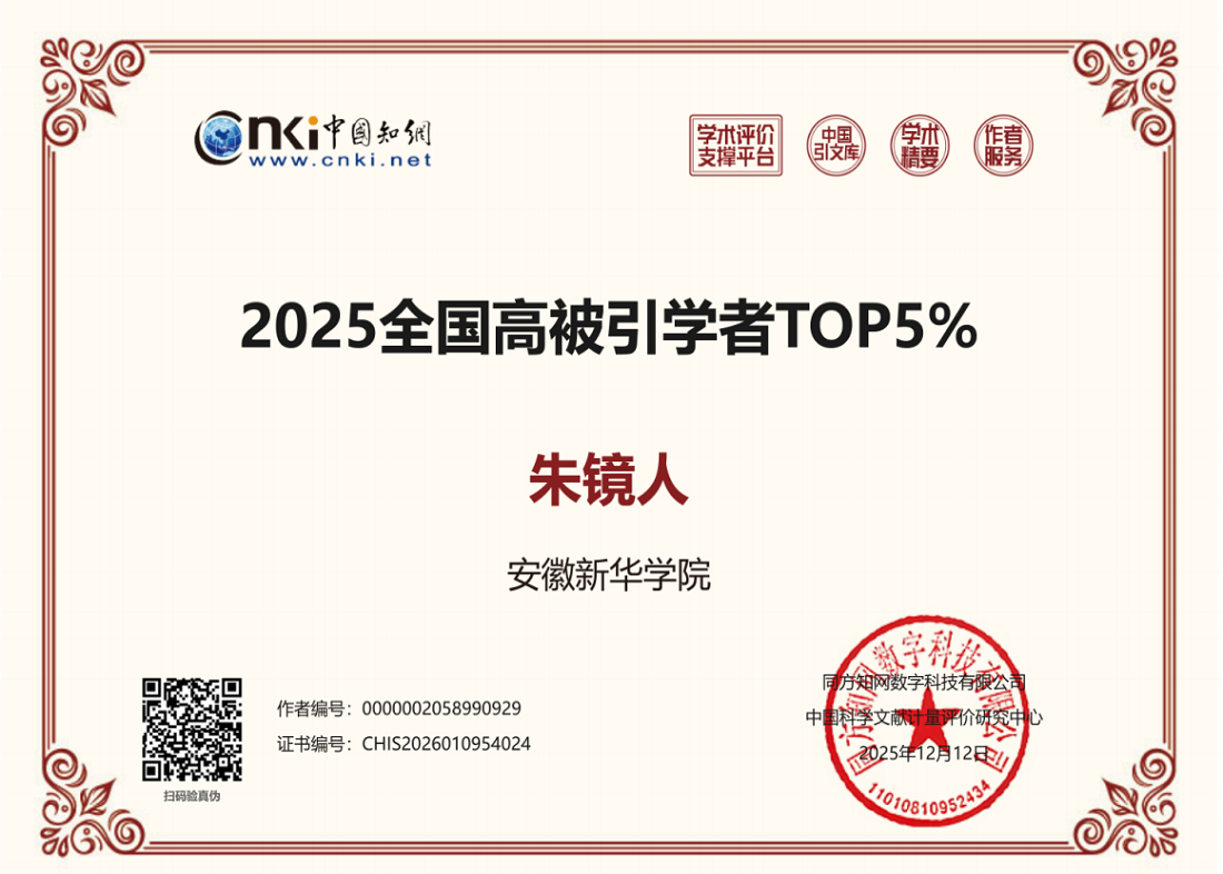 本网讯(通讯员:李彩平)近日,中国知网中国科学文献计量评价研究中心公布了“2025中国知网高被引学者”名单,大学生素质教育研究中心朱镜人教授入选“2025中国知网高被引学者”TOP5%,也是bat365本次入选唯一人文社科类学者。