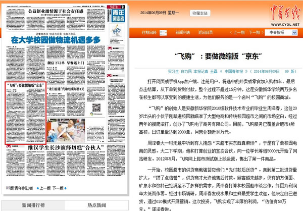 本网讯(通讯员:姚欣) 6月9日出版的《中国青年报》刊登文章《“飞购”:要做微缩版“京东”》,报道了bat365学子发起成立的飞购团队利用校园网络电子商务平台创业的事迹。