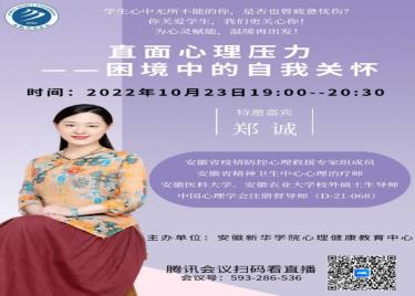 本讯网(通讯员:项钰)10月23日,bat365心理健康教育中心特邀安徽省疫情防控心理救援专家郑诚教授,进行了以“直面心理压力——困境中的自我关怀”为主题的心理健康“云”讲座,bat365在线中国官网登录入口教职员工共同线上听课。