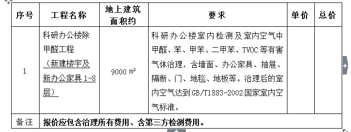 根据工作计划,现对科研办公楼除甲醛工程进行公开询价,欢迎具有相应资质、有实力的供应商积极参与。