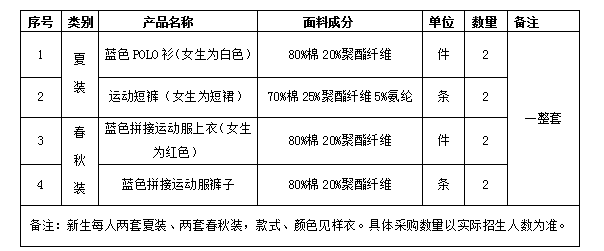 2、招标内容:2019年学生校服约370套(每套含夏装与春秋装,如下表所列:)