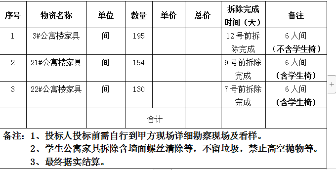学生公寓家具出售询价公告