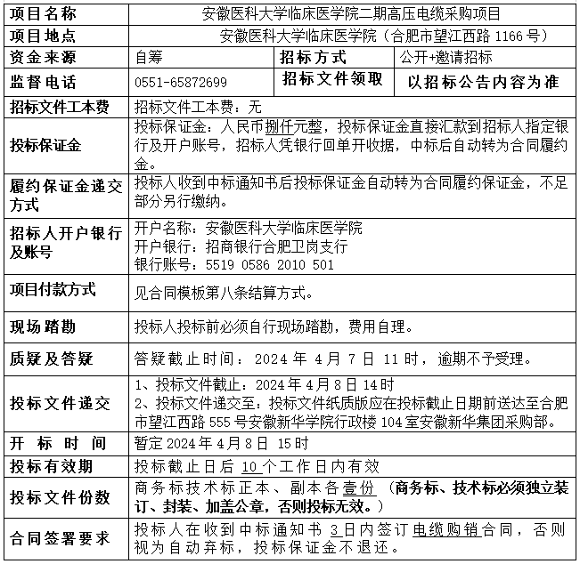 安徽医科大学临床医学院二期高压电缆采购项目招标公告