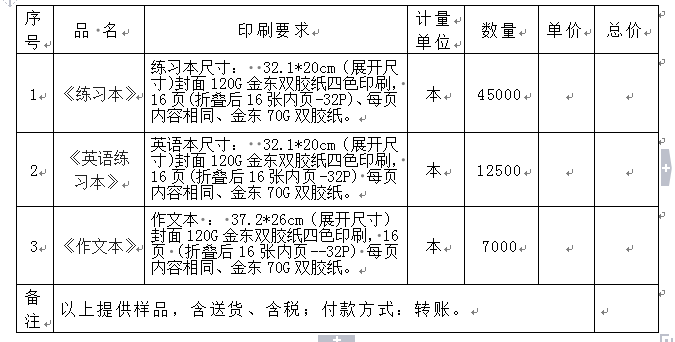 2、询价项目:《练习本》、《英语练习本》、《作文本》