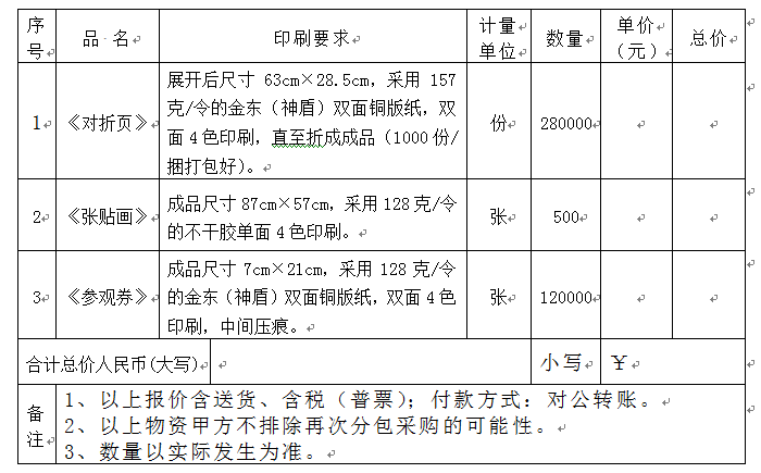 2、询价项目:《对折页》、《张贴画》、《参观券》。