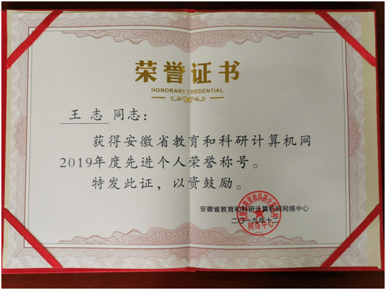 bat365在线中国官网登录入口教师荣获安徽省教育与科研计算机网“2019年度先进个人” 荣誉称号