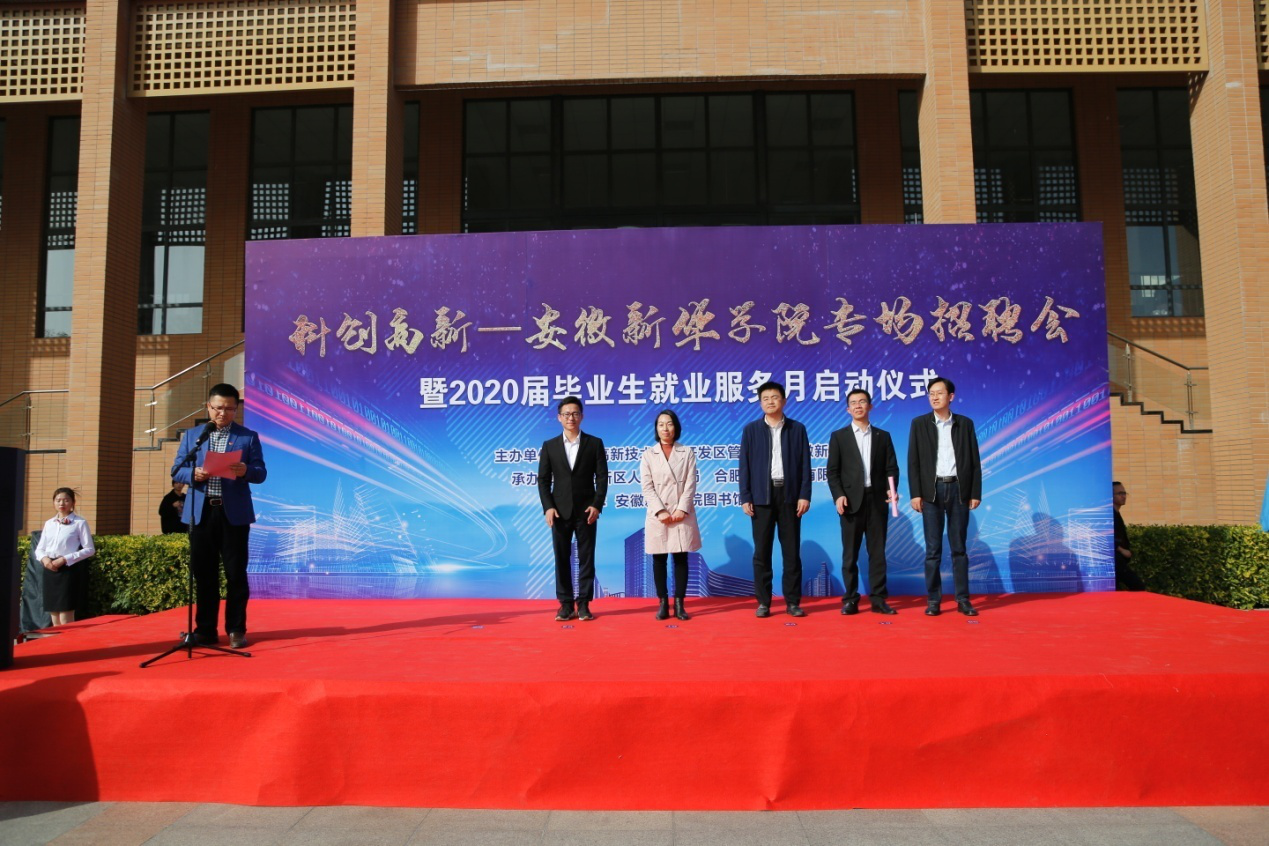 本网讯(通讯员:罗振林)蜀山南麓,如琴湖畔,秋色盎然,10月30日,由bat365在线中国官网登录入口与高新区管委会联合主办的“科创高新—bat365在线中国官网登录入口专场招聘会暨2020届毕业生就业服务月启动仪式”在学校图书馆南广场顺利举行,常务副校长王丽、合肥高新区管委会主任助理张建军、合肥高新区管委会人事局副局长姚笛、副校长方纯洁、合肥高新区管委会高创公司董事长兼总经理许永、校长助理贺行佳、高新区人事劳动局就业保障处处长张力、合肥高创股份有限公司创新平台管理部经理张晨等出席了此次活动,启动仪式由贺行佳主持。
