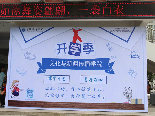 按照学校统一部署,各二级学院制作了统一的主题喷绘及特色海报。充满学院特色的作品展示,无不体现着每个二级学院的魅力所在,文化与新闻传播学院前的传媒作品放映、商学院门口的新生寄语、动漫院门口充满艺术特色的画展......都展现着该院与众不同的风采。