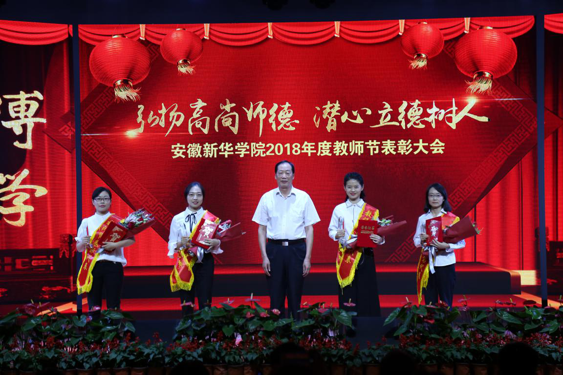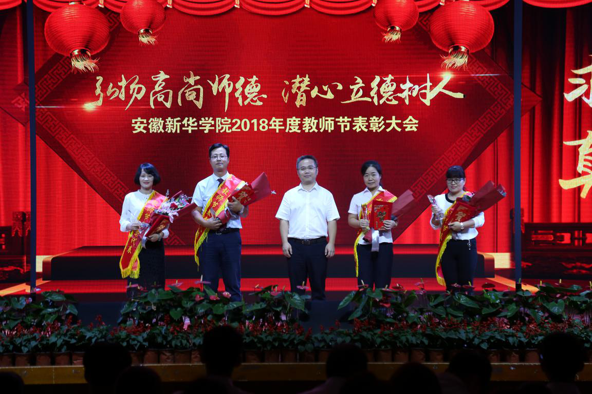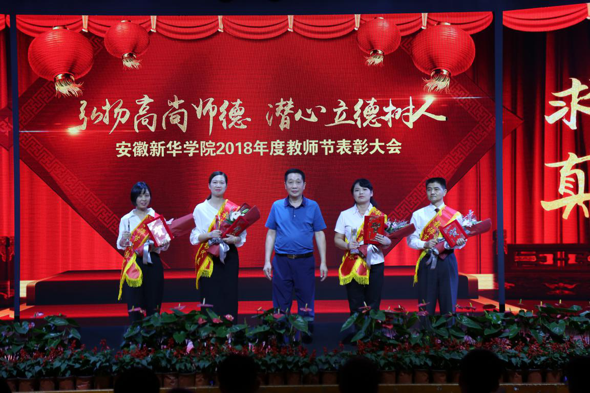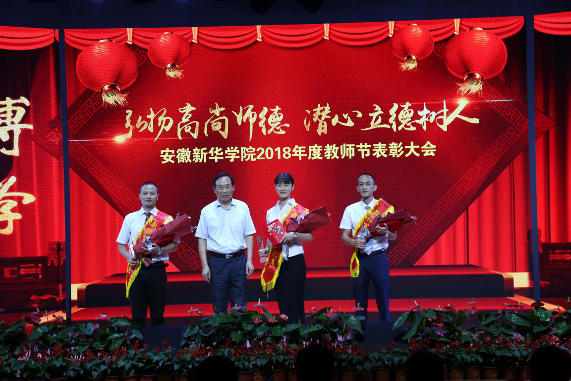 大会最后表彰的是“教书育人楷模”,新华集团总裁张明为获奖教师颁奖。