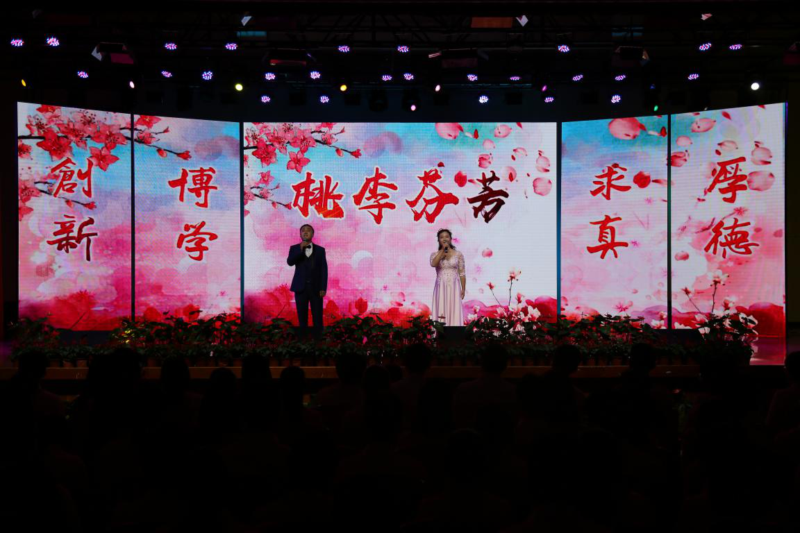 第三篇章表彰了“最受欢迎教师”“教坛新秀”“教学名师”“教书育人楷模”。首先登场的是“最受欢迎教师”,集团总裁助理、学校副校长陈明,校长石秀和分别为获奖者颁奖。
