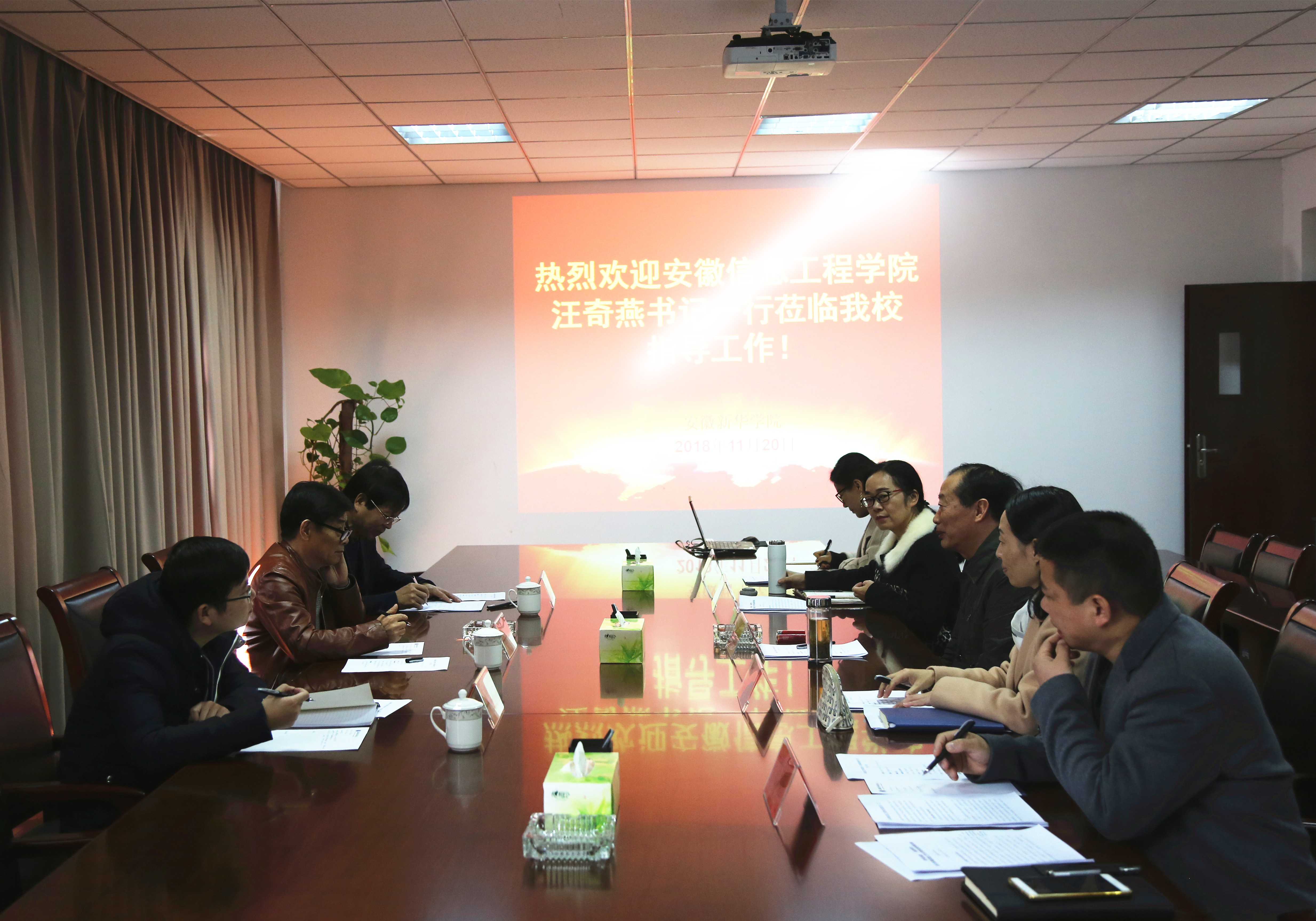 本网讯(通讯员:程海青)11月20日上午,安徽信息工程学院党委书记汪奇燕、党委办公室主任袁龙喜、党务专员阚海峰一行来bat365就党建工作和学校发展进行考察交流。省督导专员、校党委书记储国定,常务副校长王丽,学校办公室(发展规划处)主任盛晓青及党委组织部相关人员等参与接待。
