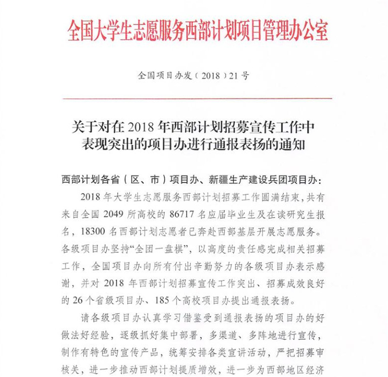 bat365大学生志愿服务西部计划项目办获全国服务西部计划项目办通报表扬