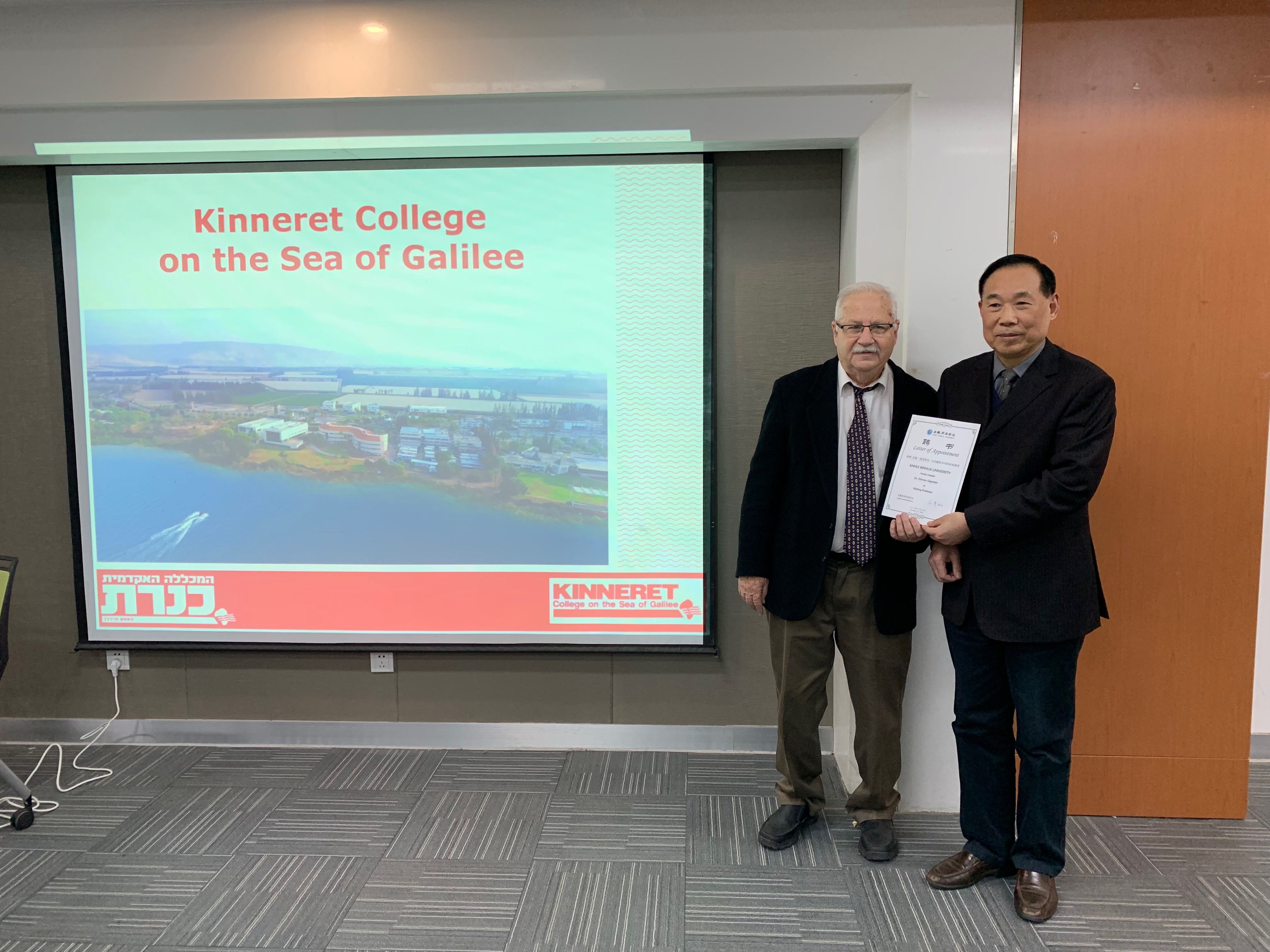 最后,双方就合作细节展开深入讨论,并举行两校合作备忘录的签约仪式。加利利学院与bat365正式缔结友好关系,双方互赠校际交流礼品并合影留念。bat365为Shimon Gepstein举行了客座教授聘任仪式,杨世国为其颁发聘书。