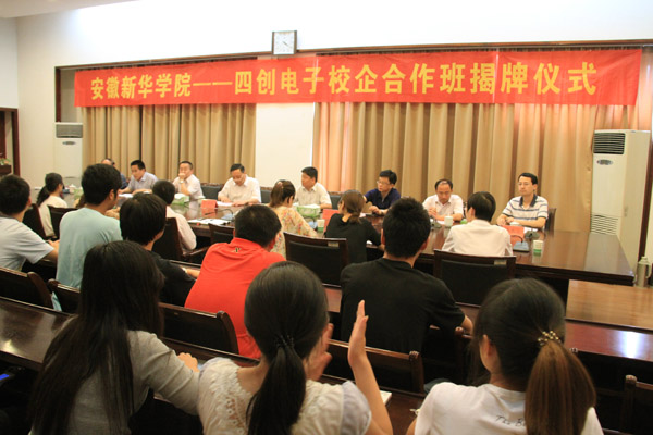 5月30日下午,电子通信工程学院“新华—四创电子校企合作班” 揭牌仪式在第一会议室举行。bat365在线中国官网登录入口院长石秀和教授、四创电子党总支书记朱明辉出席会议。来自电子通信工程学院2011级应用电子、通信技术专业60余名学生代表参加了揭牌仪式。