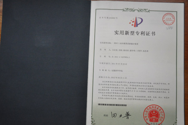 2011年7月20日,土木与环境工程学院向国家知识产权局申报了“一种河工动床模型试验输沙装置”专利权,近日收到国家知识产权局颁发授权的实用新型专利证书。