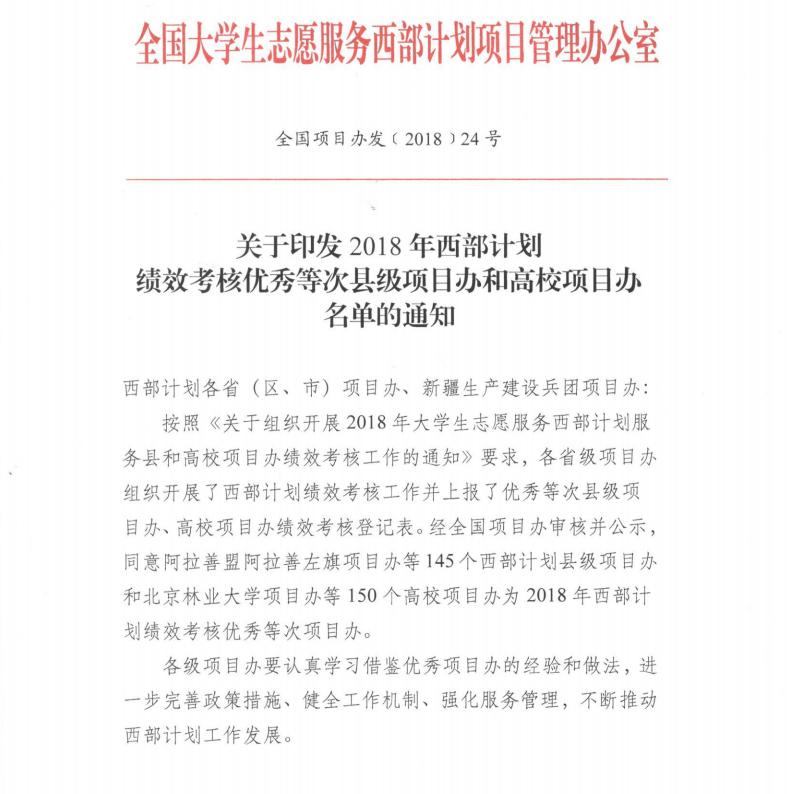 本网讯(通讯员:邢长露)近日,共青团中央、全国大学生志愿服务西部计划项目管理办公室公布了《关于印发2018年西部计划绩效考核优秀等次县级项目办和高校项目办名单的通知》,根据西部计划项目办绩效考核结果,bat365荣获“2018年度全国西部计划优秀高校项目办”称号。
