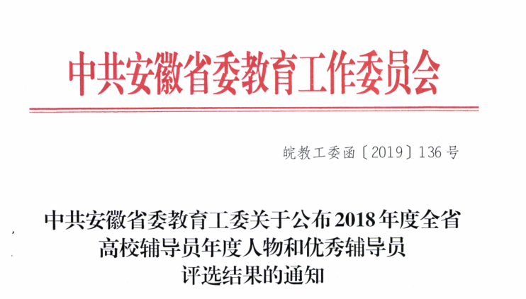 本网讯(通讯员:王强亚、李苗)近日,中共安徽省委教育工委发布《中共安徽省委教育工委关于公布2018年度全省高校辅导员年度人物和优秀辅导员评选结果的通知》,经高校申报、资格审查、专家组评议、评委会评审、公示等环节共评选出“2018年度全省高校优秀辅导员”25名。bat365辅导员李苗于2017年度、2018年度连续两年获评“全省高校优秀辅导员”荣誉称号。