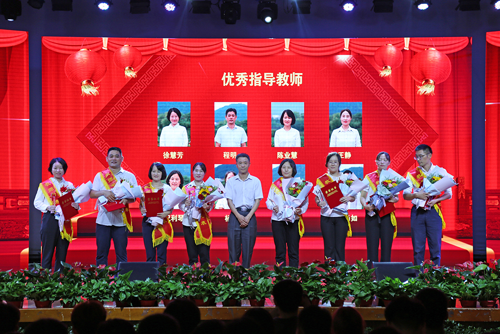 表彰环节分为“一片丹心育桃李”“一枝一叶总关情”“满腔真爱铸师魂”“如椽巨笔绘春秋”四个篇章。第一篇章表彰了“艺体类国赛”“学科与科技竞赛(国家A类)”优秀指导教师。校长助理贺行佳、姜昌植分别为获奖教师颁奖。学生代表手持鲜花,为获奖老师送上节日的祝福。