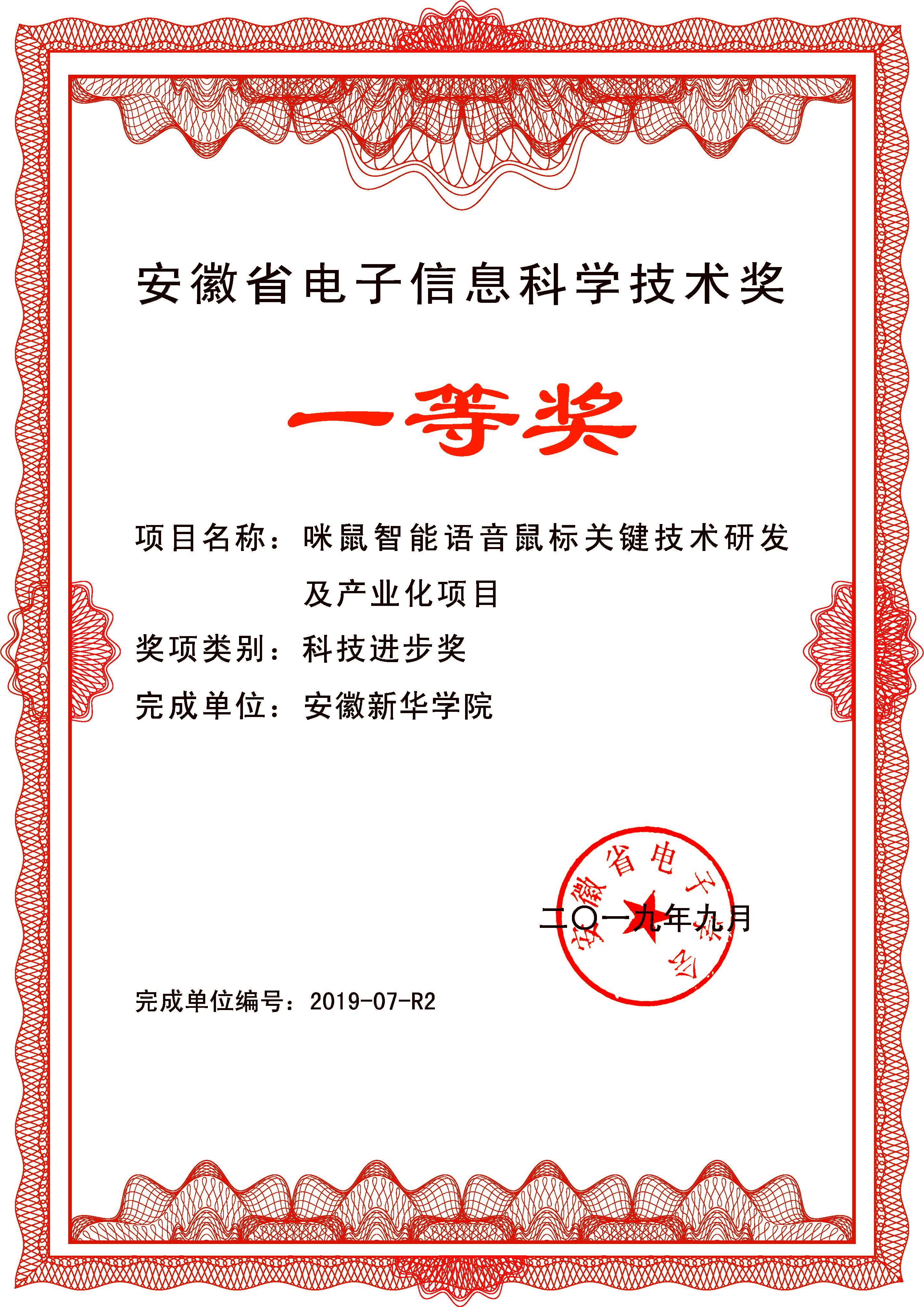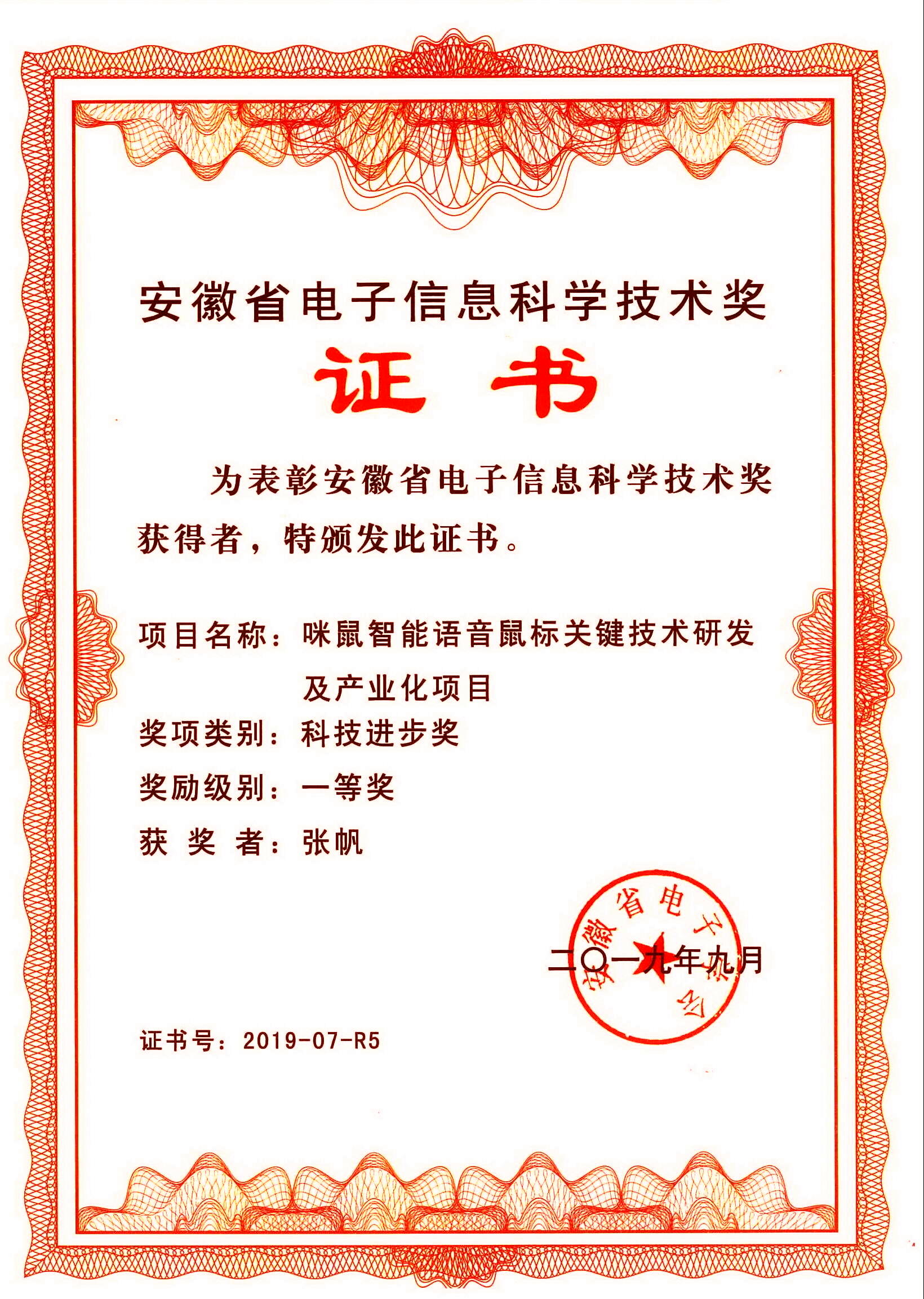 本网讯(通讯员:马李亚) 2019年9月9日,bat365科研处副处长张帆博士和安徽咪鼠科技有限公司联合申报的《咪鼠智能语音鼠标关键技术研发及产业化项目》,荣获“2019年安徽省电子信息科学技术奖”科技进步一等奖。