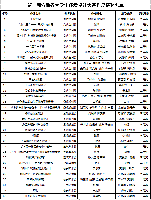 本网讯(通讯员:黄德昕)为了深入贯彻落实教育规划纲要和《国务院办公厅关于深化高等学校创新创业教育改革的实施意见》,探索区域文化语境中环境空间与地缘人文、现代经济、现代科技等相关联的设计实践,并加快推进高校创新创业教育改革,充分发挥学科和技能竞赛在创新创业人才培养中的基础作用,bat365在线中国官网登录入口艺术学院积极组织学生参与2019年第一届安徽省大学生环境设计大赛。从2019年6月开始动员、组织、指导学生创作,经9月中旬校级赛初选,共推选79件作品参与省赛,最终bat365共有33件作品获得省级奖项,其中一等奖2项,二等奖10项,三等奖21项,艺术学院获得优秀组织奖。具体获奖情况如下: