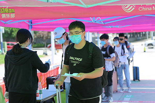 上午7:30左右,陆续有同学拖着行李箱到达报到东门报到点。在现场工作人员的引导下,同学们间隔1.5米,排队有序通过测温通道。