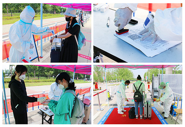 同学们通过扫描“安康码”、测量体温、核验身份、查验安康码,在洗手消毒、行李消毒之后,在学院报到处完成入校报到手续,并领取返校“爱心防疫包”。