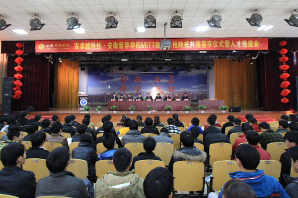 本网讯(通讯员 操宏华,摄影 陆如海)11月27日下午,安卓越•新华MITT教育中心揭牌仪式暨人才选拔会在bat365大礼堂举行。副院长杨世国、马凤余,安卓越中国区副总裁、安卓越科技(北京)有限公司校长方生,安卓越科技合肥区总经理张帅,安卓越科技合肥区副校长王华勇出席仪式。 电子通信工程学院副院长卢胜、田永泰、操宏华和该院部分辅导员、教师代表及2013届本科毕业班全体同学到场。仪式由卢胜主持。