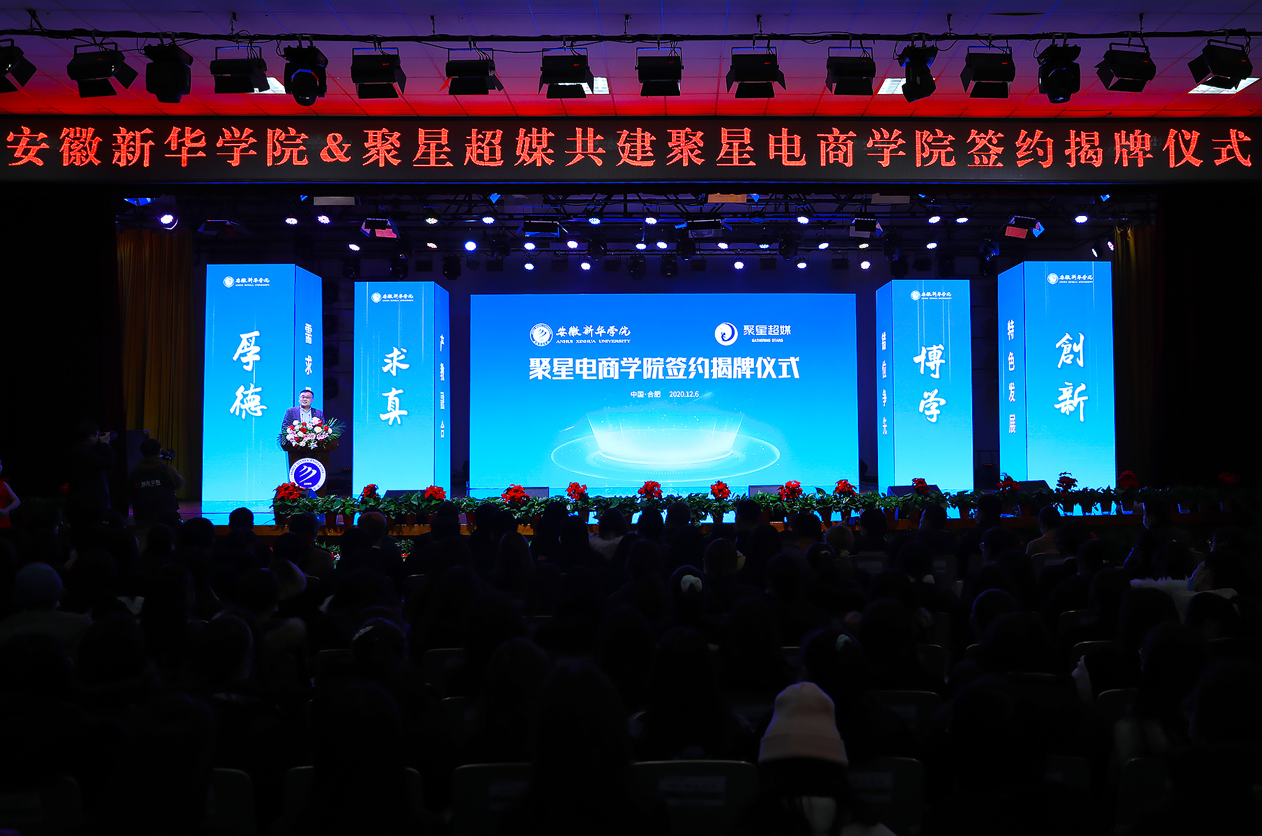 本网讯(通讯员:王伟灿 摄影:翟漱文)12月6日,bat365与聚星超媒共建聚星电商学院签约揭牌仪式在大礼堂举行。此次校企携手,双方将充分结合学校办学定位和聚星超媒平台优势,深化校企合作,推进产教融合,将打造一所数字媒体与文化产业学院,力争在人才培养、内容生产、市场拓展、数字化运营等各方面取得丰硕成果,助推中国数字媒体经济时代的人才培养和输送。
