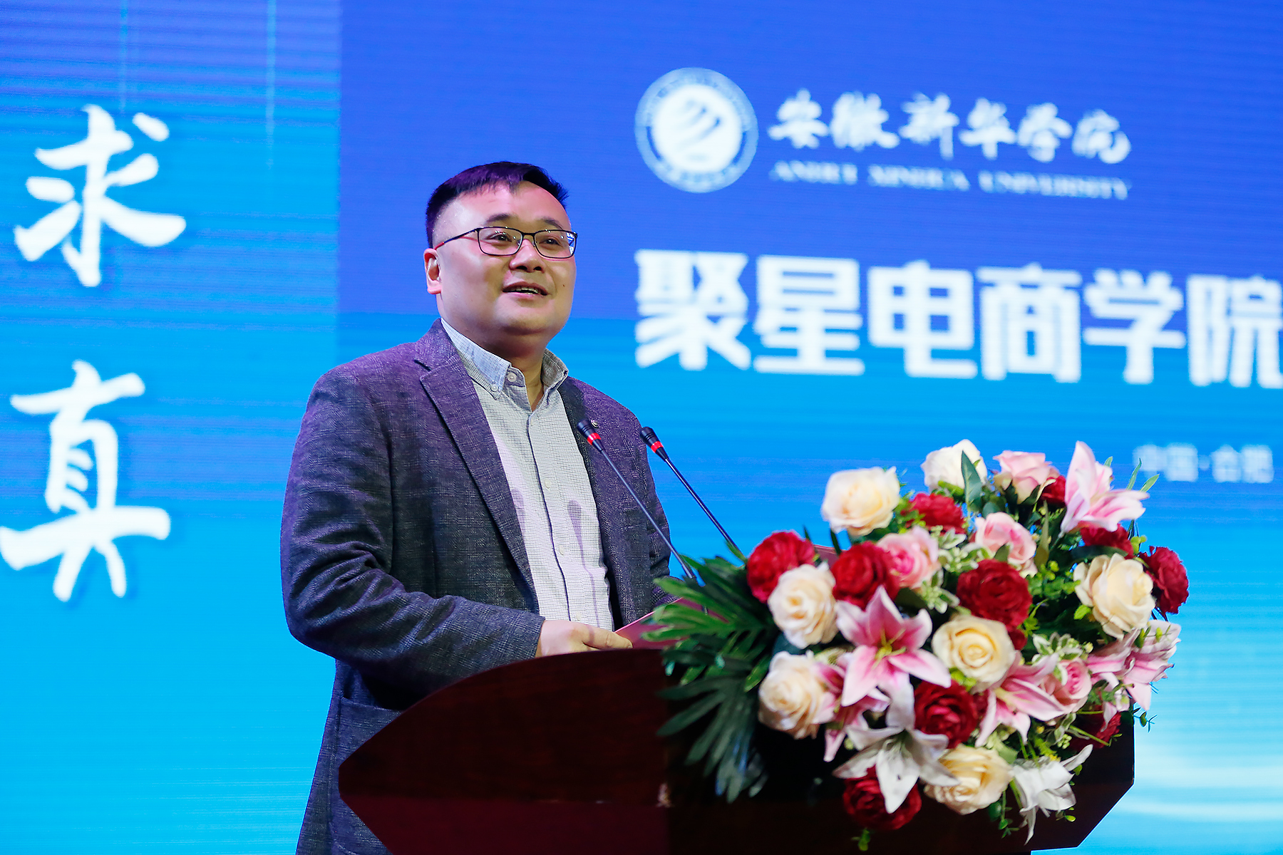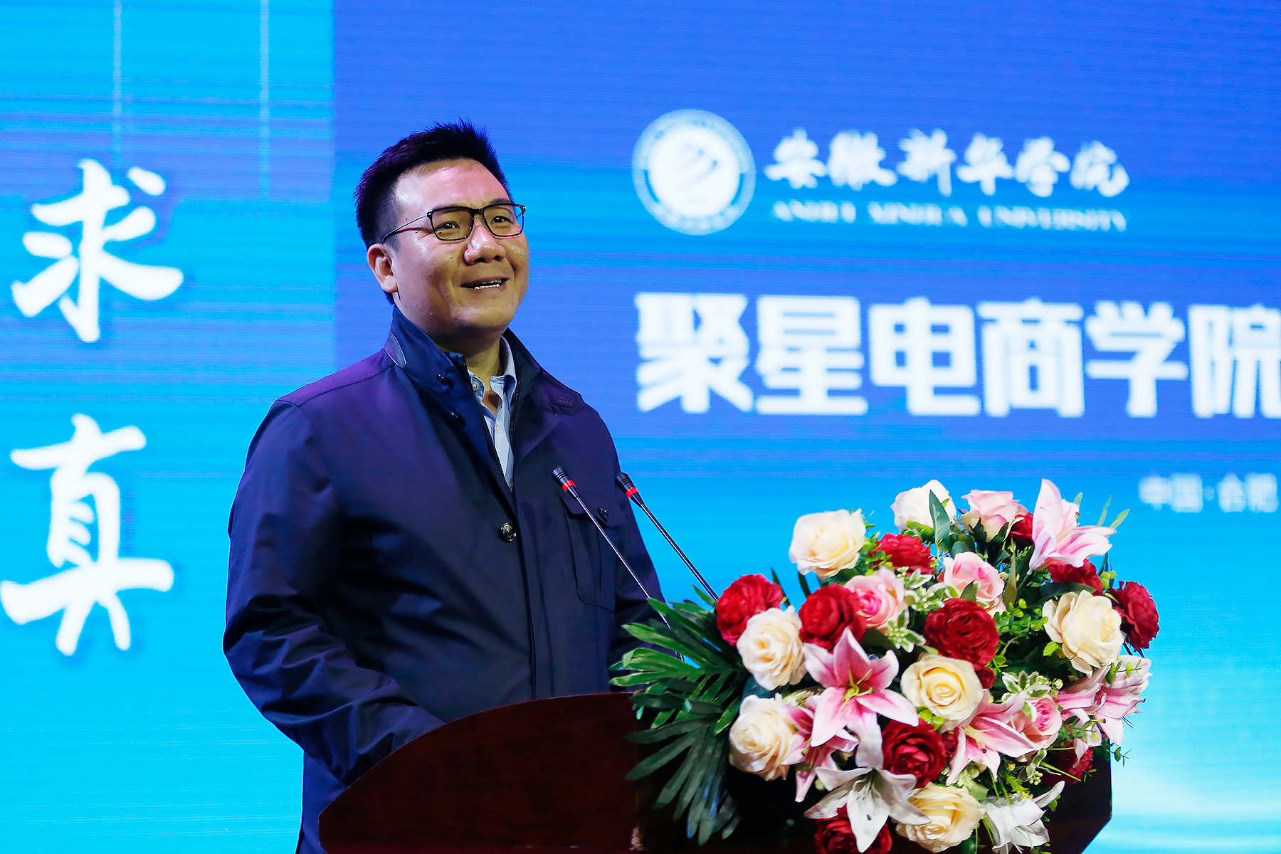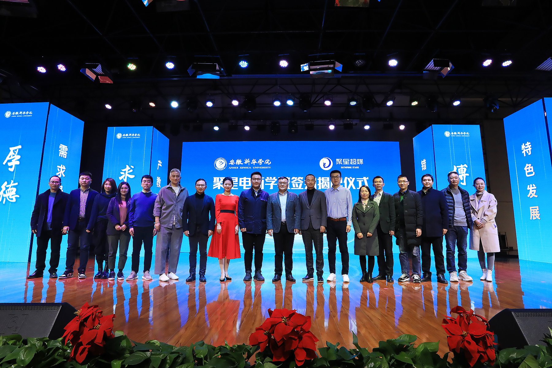 随后,银河酷娱创始人、聚星超媒董事长李炜,聚星超媒CEO徐硕,新华集团副总裁、校董事长王孝武,校执行董事储国定共同为聚星电商学院揭牌。