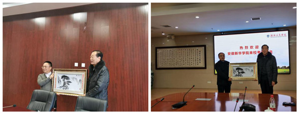 调研考察中,储董代表bat365分别向两所高校赠送了具有安徽特色的迎客松铁画。