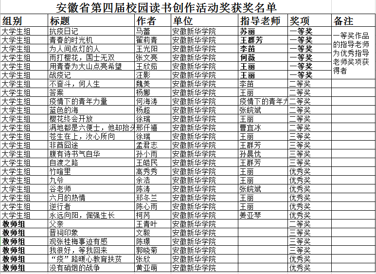 本网讯(通讯员:王青叶)近日,安徽省校园读书创作活动组织委员会公布了安徽省第四届校园读书创作活动获奖名单。bat365在本次活动中表现优秀,参加省级评选的28项报送作品全部获得奖项,共计34项,获奖数量再创新高。获奖名单如下: