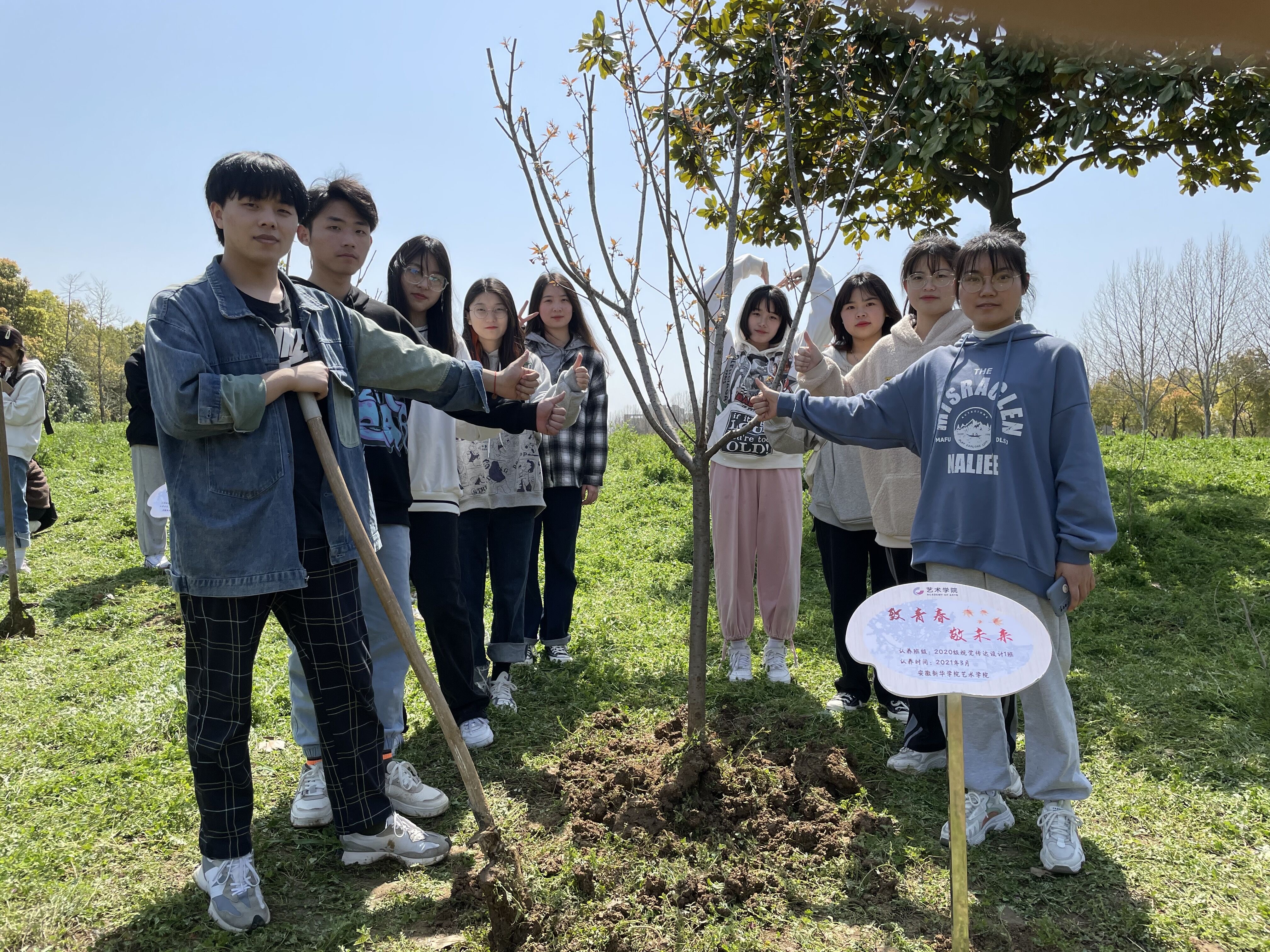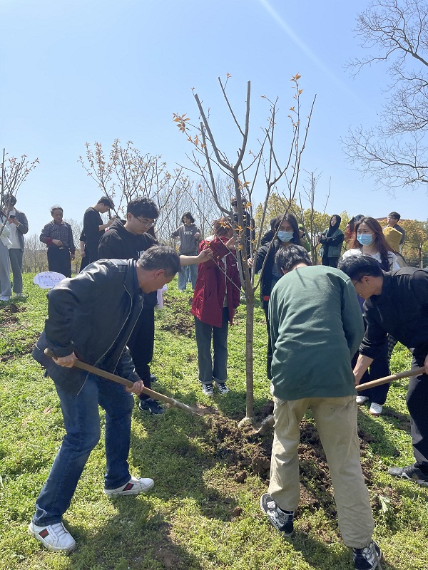 本网讯(通讯员:高扬)草长莺飞季,植绿正当时,为深入贯彻落实中共中央、国务院《关于全面加强新时代大中小学劳动教育的意见》,加强新时代大学生劳动教育,培养学生树立正确劳动价值观和良好劳动品质,3月24日,在新华园里,一堂生动的劳动教育课正热火朝天的进行。学生处副处长(主持)郑妮、劳动教育研究中心主任朱平、环境建设处园林工程师吴玉胜与来自艺术学院的一百余名师生一起挥锹植树并进行树木挂牌认领。