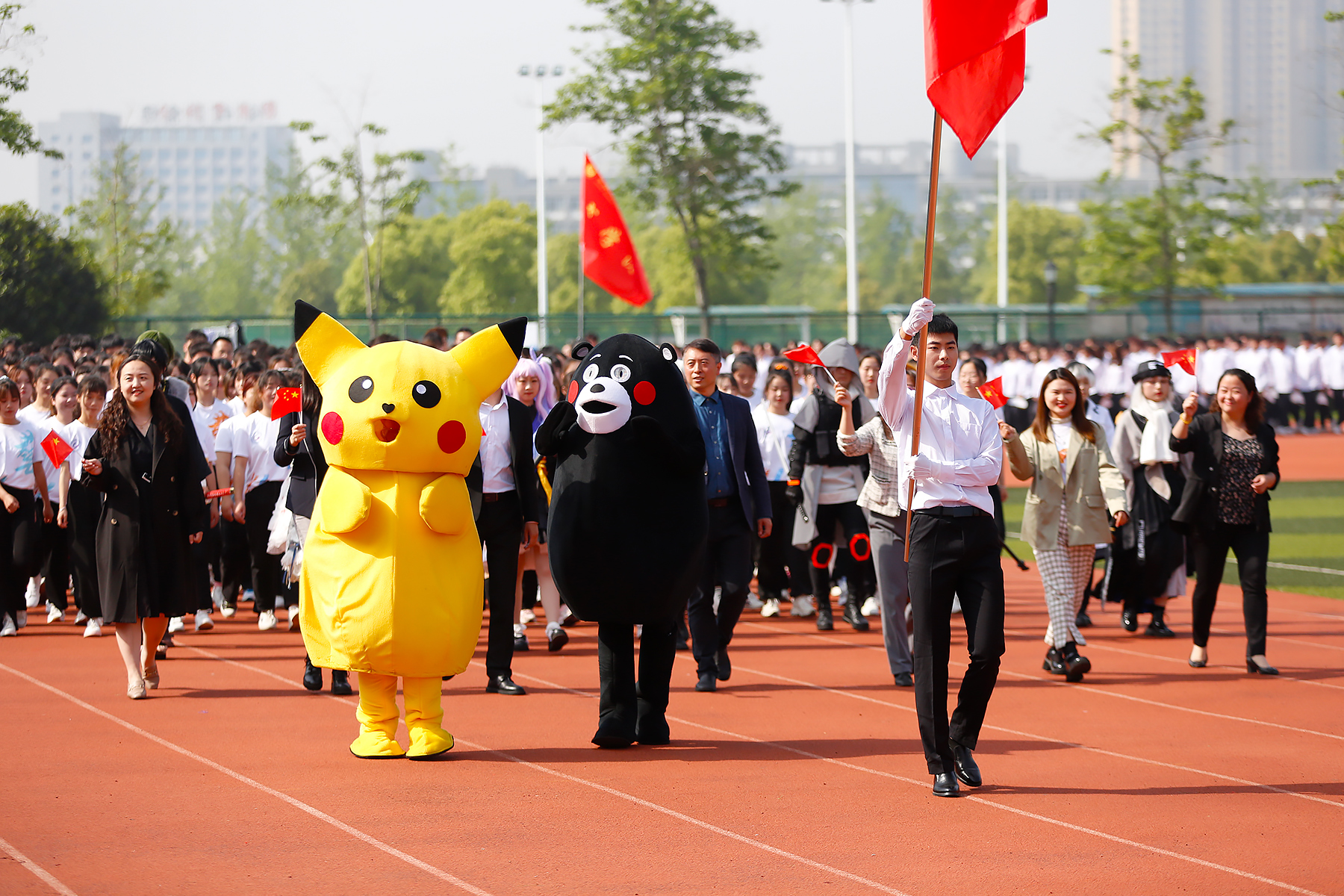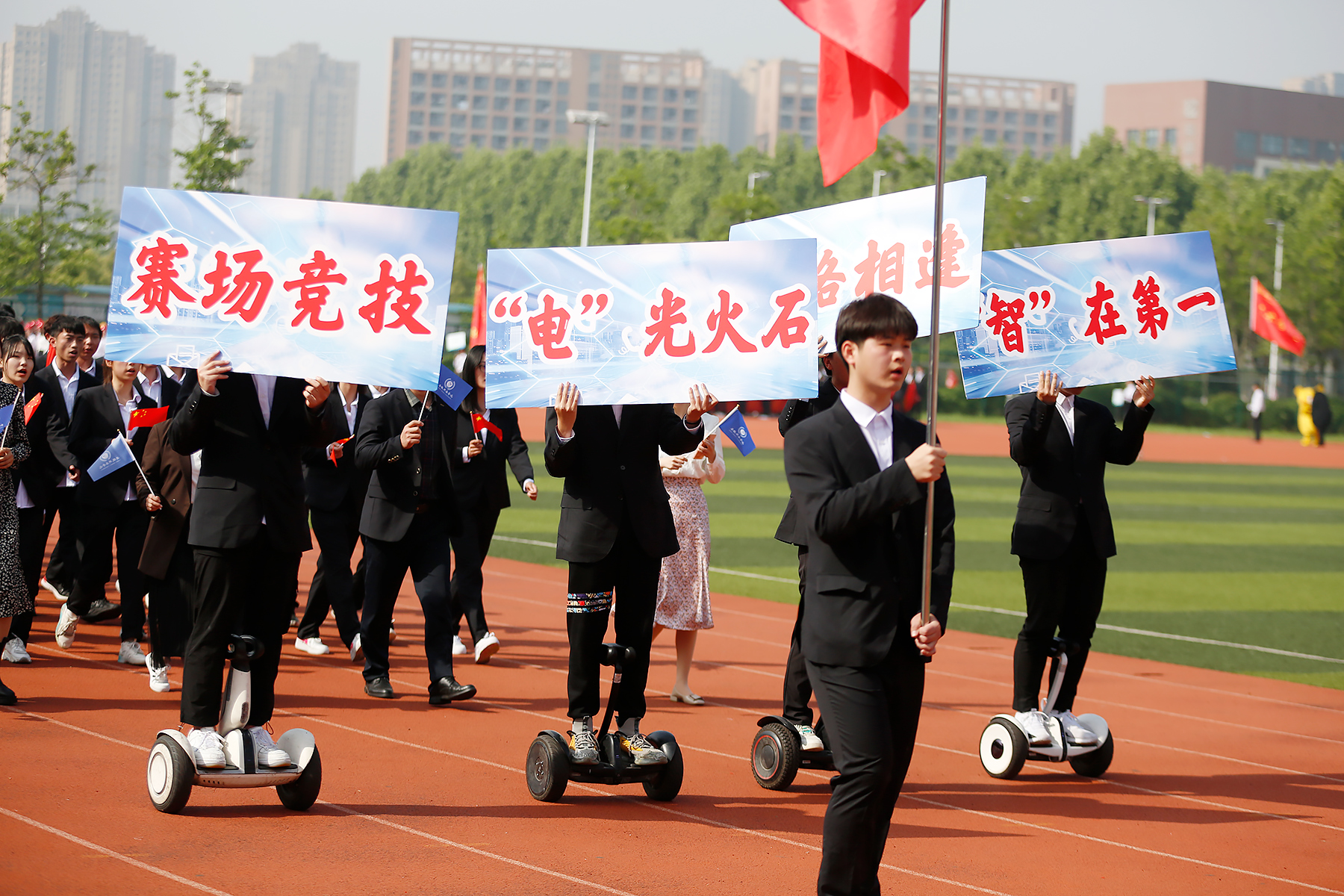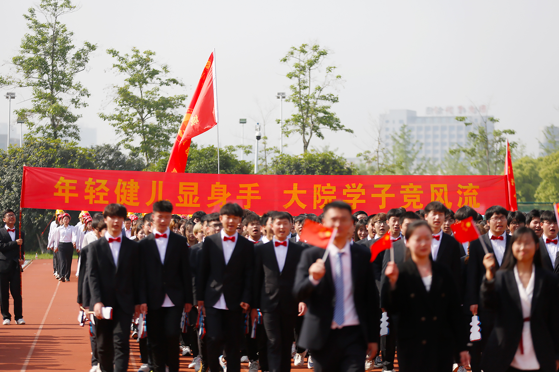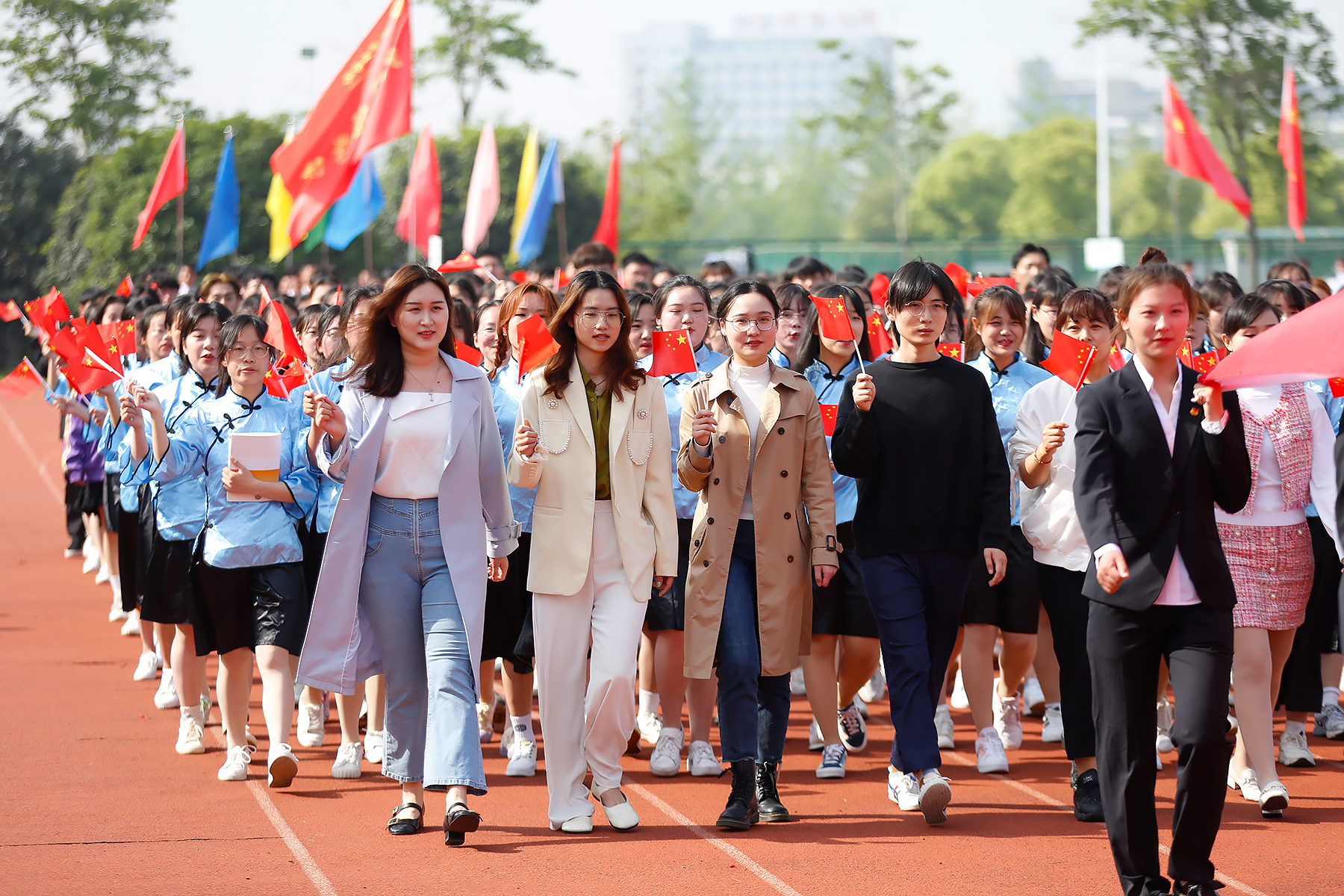 接着,各二级学院代表队依次入场。运动场上,他们步伐坚定,手中的红旗飘扬,是涌动在新华学子心中的红色精神。