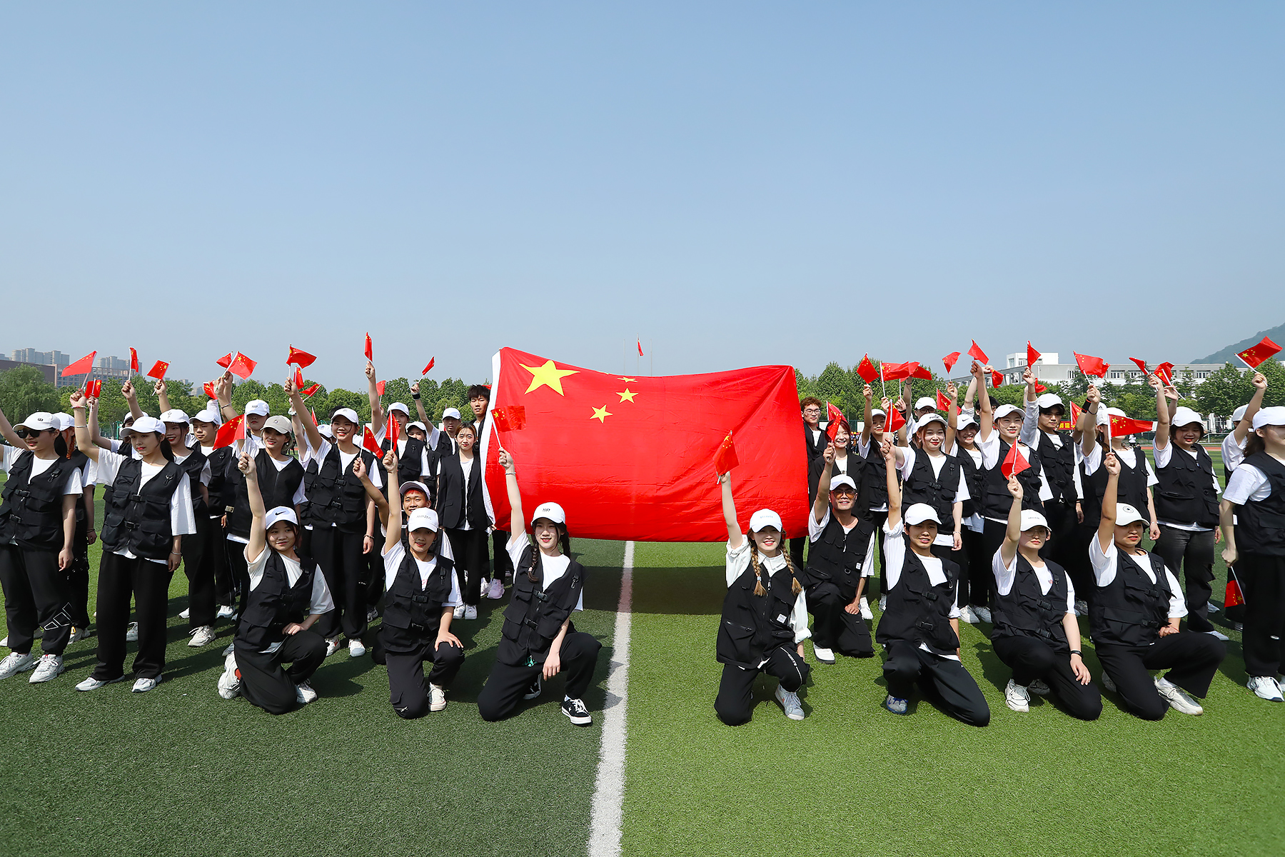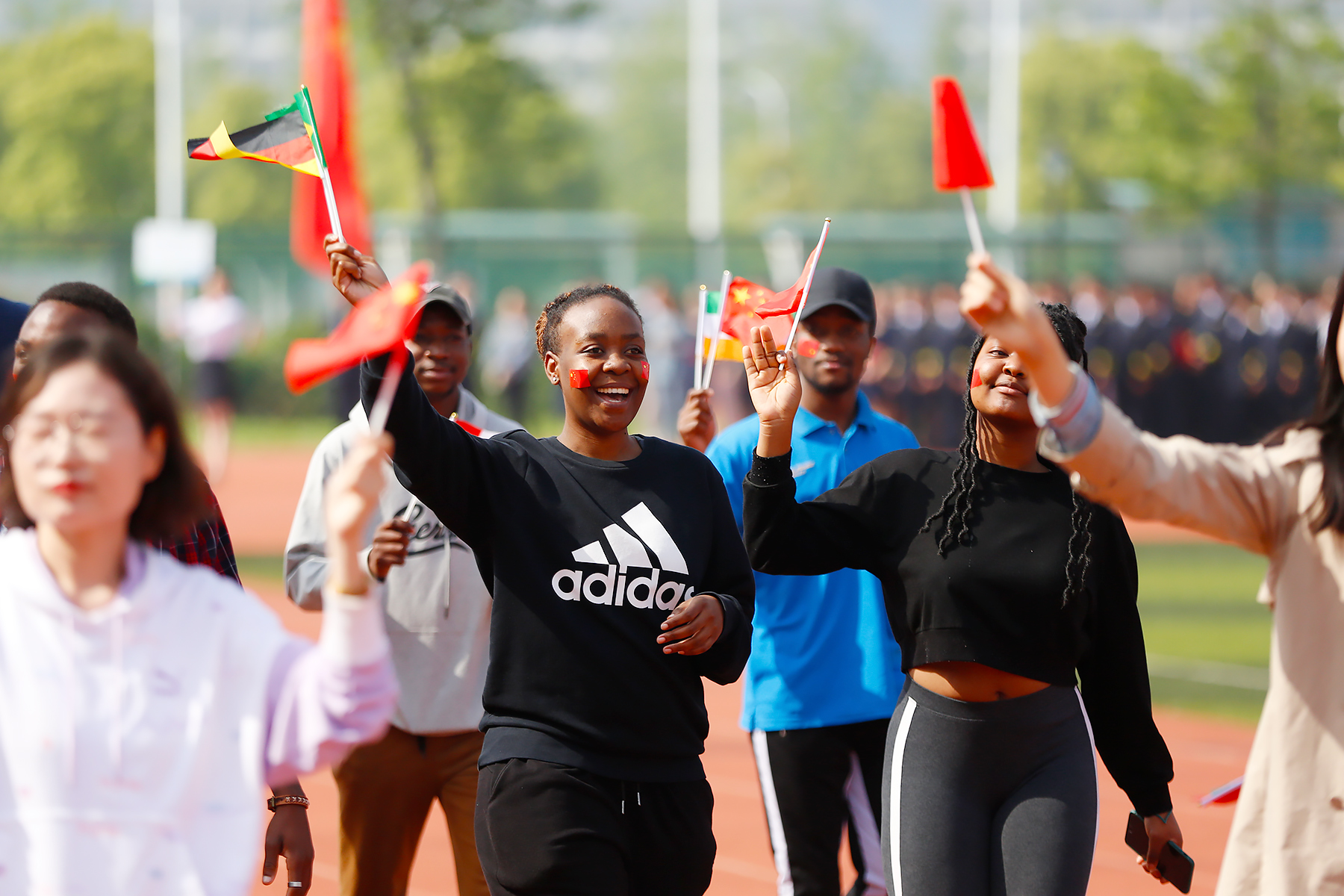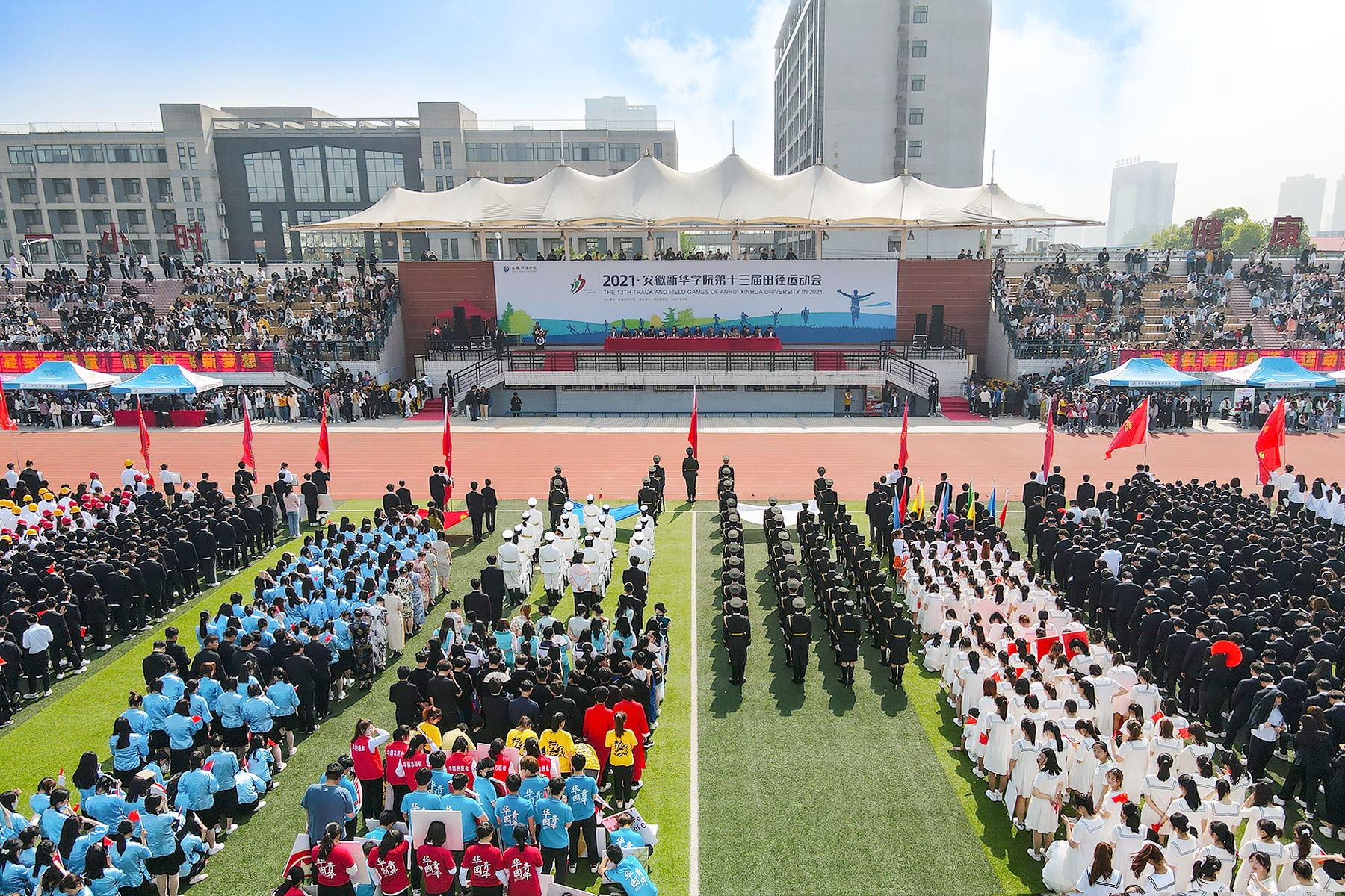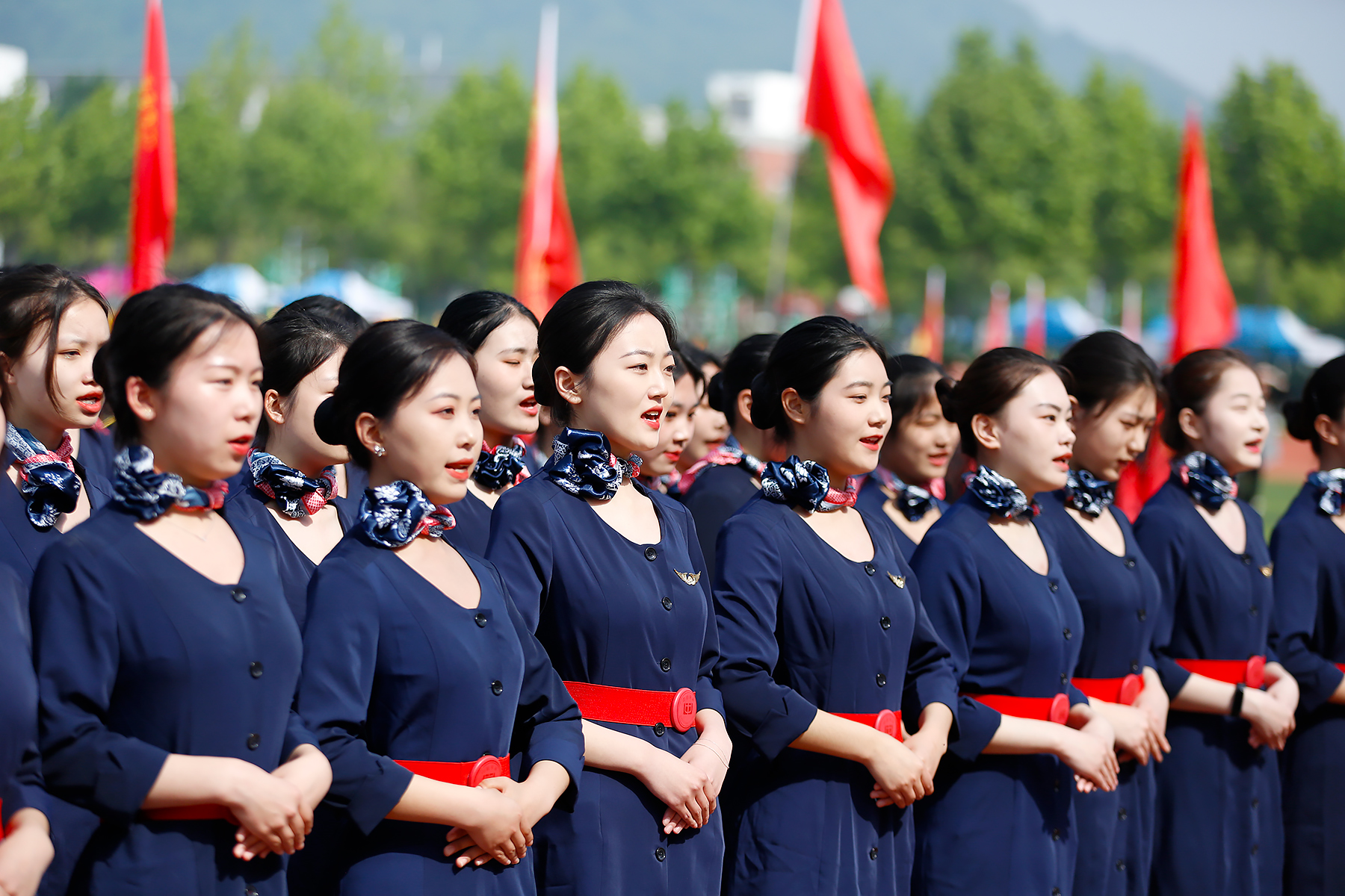接着,各二级学院代表队依次入场。运动场上,他们步伐坚定,手中的红旗飘扬,是涌动在新华学子心中的红色精神。