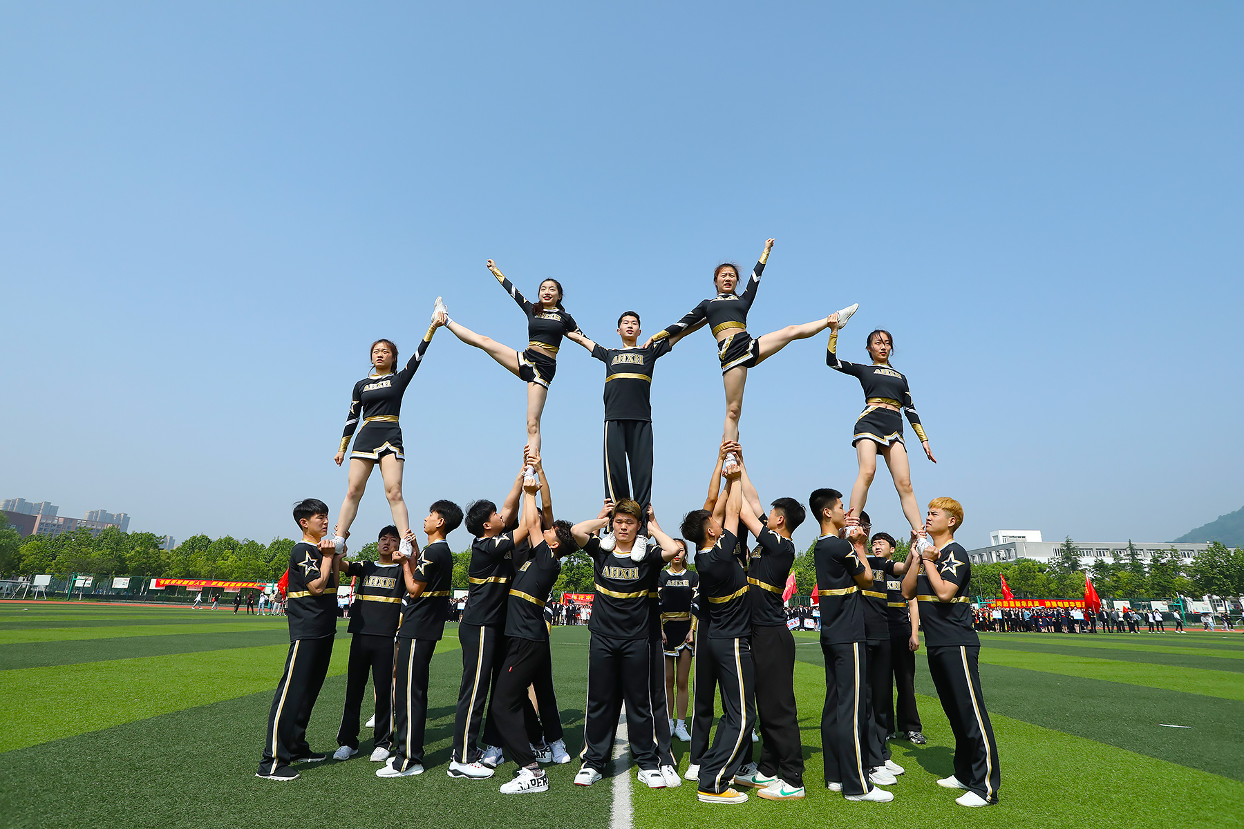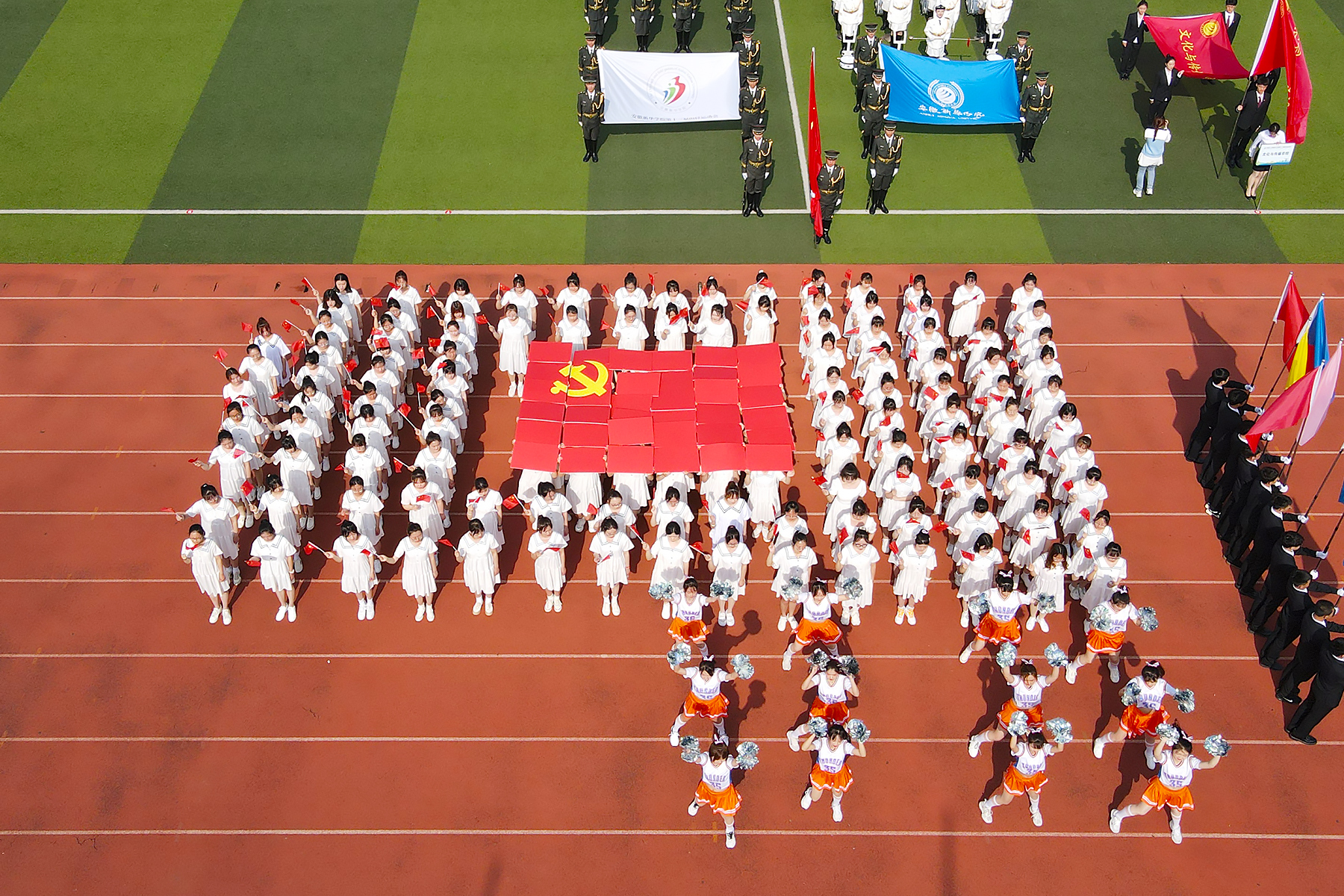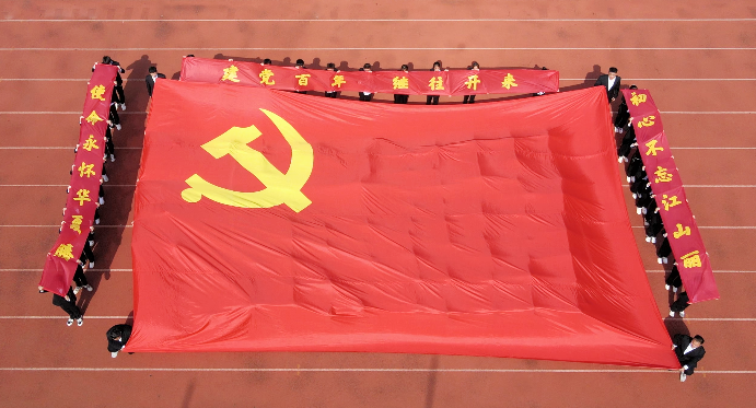 外国语学院、商学院方阵变换造型拼出“党旗”,科技学院/继续教育学院手持“热烈祝贺中国共产党成立100周年!”横幅。药学院手执党旗向伟大的中国共产党深情致意。财会与金融学院用红黄相间的旗帜摆出“中国牛”方阵,蕴含着新华园学子自强不息、砥砺奋进的精神密码。千秋伟业,百年风华,各学院将党的精神和学院精神相结合,用手中的党旗和立牌,表达自己对党百年诞辰的祝福。