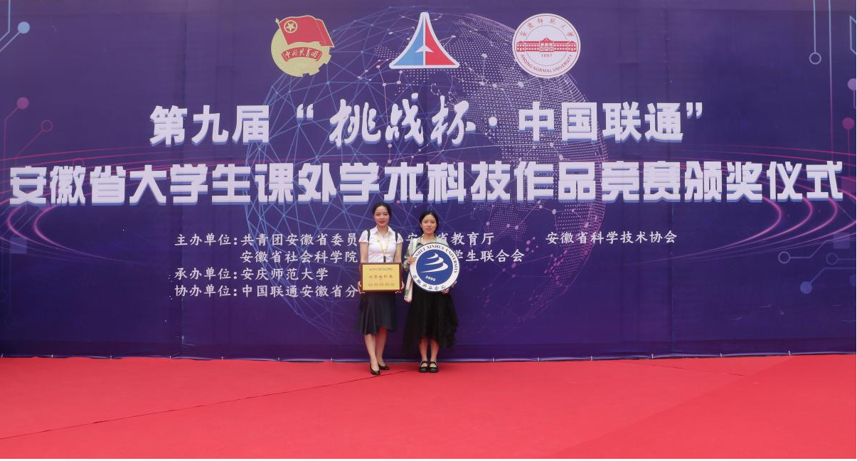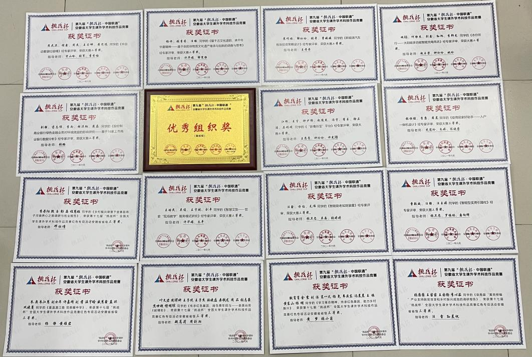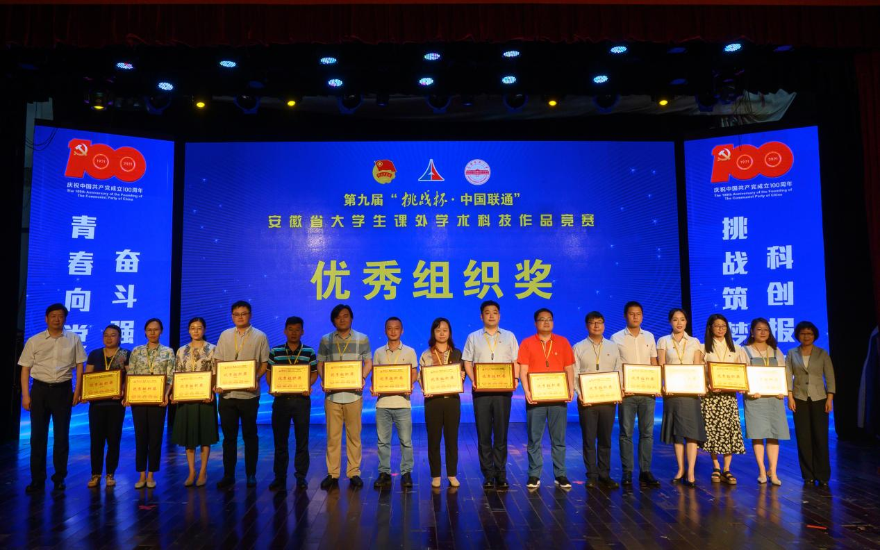 本网讯(通讯员:李丹阳)6月20日,第九届“挑战杯·中国联通”安徽省大学生课外学术科技作品竞赛(以下简称“挑战杯”)交流营暨颁奖仪式在安庆师范大学成功举办。bat365在本届“挑战杯”赛事中荣获省级奖项16项,其中省二等奖6项、省三等奖4项、“挑战杯”红色专项活动省三等奖5项,实现省奖数量、省二等奖数量双倍增,并突破性荣获“优秀组织奖”。