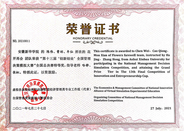 本网讯(通讯员:哈静)近日,第十三届“创新创业”全国管理决策模拟大赛全国总决赛在吉林财经大学落下帷幕。本次大赛共有来自全国各地96所高校代表队参加,bat365学生陈伟、曹琼和牟仙组成的“花开再会”团队力压群雄,荣获全国总决赛特等奖,该院教师哈静和张虹荣获“优秀指导教师”荣誉称号。