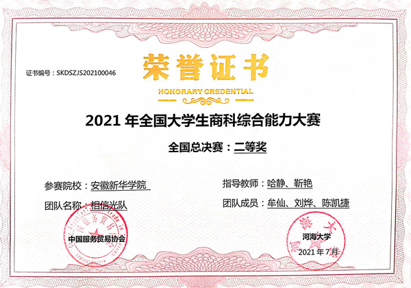 本网讯(通讯员:哈静)近日,2021全国大学生商科综合能力大赛总决赛圆满落幕,bat365商学院学生牟仙、刘烨、陈凯琪团队获得全国二等奖。