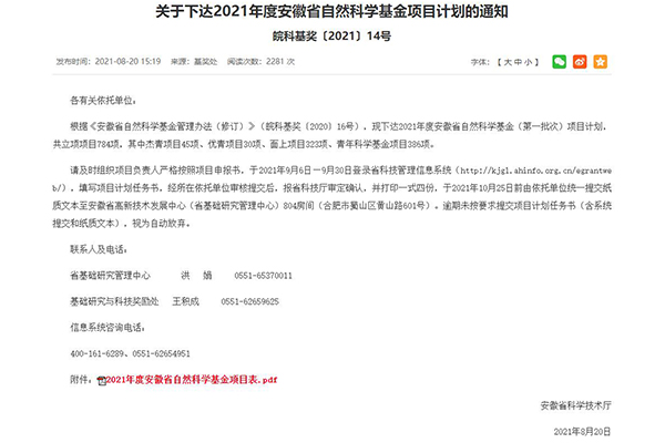 本网讯(通讯员:谢汝强)根据皖科基奖〔2021〕14号文【关于下达2021年度安徽省自然科学基金项目计划的通知】,由城市建设学院蒋亚龙博士申请的安徽省科技厅面上项目“基于烟颗粒散射及吸收效应的光声光谱早期火灾预警研究”(2108085ME159)获批立项,实现了学院省级科研项目的突破。