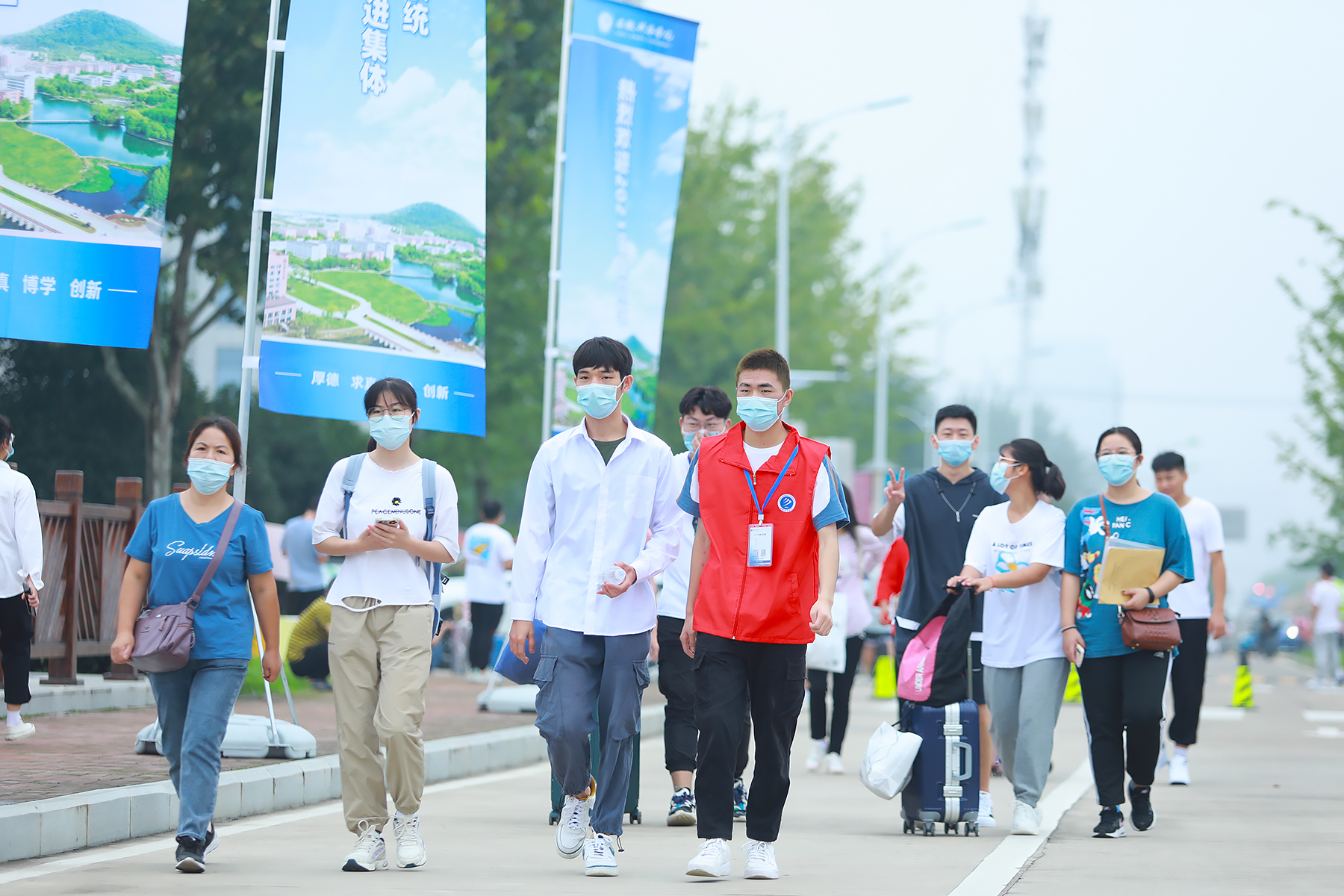 校园里,暖心的条幅、热情的老师和同学们都在迎接着新生的到来。“同学,你好!请问需要帮助吗?”厚德路上,由学长学姐们组成的志愿团队积极为新生提供帮助。同时,为了让新生能更方便地办理入学报到手续,每个二级学院均设有专门的报到点,并分配了志愿者进行引导,帮助新生尽快完成注册报到手续。