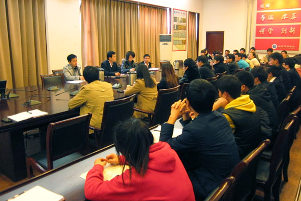 座谈会前,团委书记朱兆健首先向同学们宣布了2013年团委人员工作分工,团委副书记王帆介绍了本年度团委重点工作和主题活动。