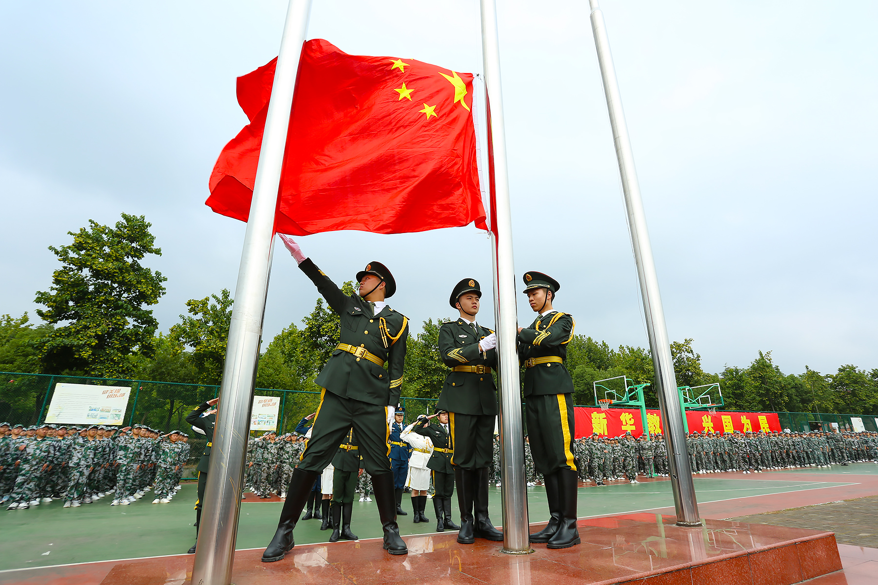 上午9时,开学典礼在雄壮的国歌声中拉开序幕。国旗护卫队旗手奋力将国旗展向天空,鲜艳的五星红旗荡出优美的弧线冉冉升起,全体师生面向国旗,升国旗、唱国歌。