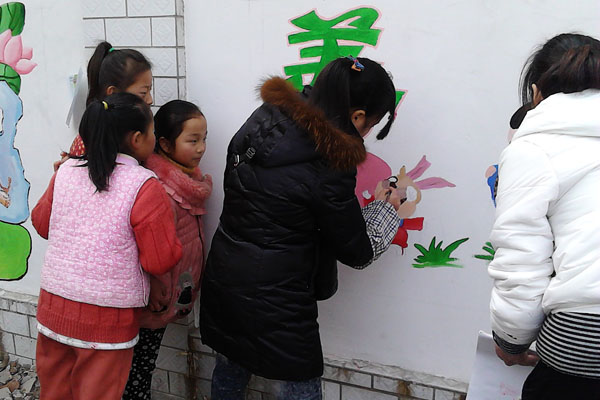一幅幅精美的画面,一份份真挚的感情,志愿者们用自己的爱心为韩圩小学的小朋友们送去了十二份手绘墙报。由于学校的基础设施差,距离市区远,缺少美术老师,在韩圩小学的校园里,围墙壁面上,没有孩子们喜欢的卡通壁画。为了帮孩子们解决这个问题,从去年的一月份到年初,志愿者们前后奔赴肥西县三次,共为孩子们完成了12面主题分别为真、善、美、仁、谦、勤、爱、礼、孝、诚、信、义的墙面壁画。为了能圆满完成任务,志愿者们也下足了功夫。由于大多数人都不擅长美术,缺少材料,大家不仅在图书馆及网上找了大量的素材,还邀请了动漫学院的“外援”支持。