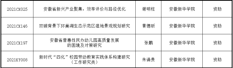 上述4项课题分别是财会与金融学院朱诵贵副教授申报的《新时代“四化”校园劳动教育实践体系构建研究》、谢明柱讲师申报的《安徽省新兴产业聚集:效率评价与路径优化》,艺术学院黄德昕副教授申报的《双碳背景下环巢湖生态示范区湿地景观规划研究》,文化与传媒学院张鹏教师申报的《安徽省普惠性民办幼儿园高质量发展的困境及对策研究》,具体获批情况如下图: