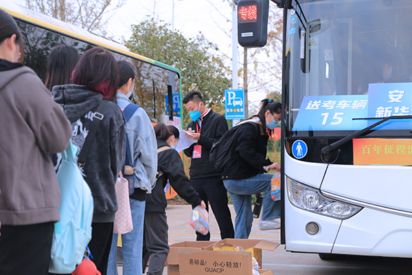 疫情当前,为了做好送考服务,10月25日起,学校精准摸排了各时间和考点学生人数,明确需送考人员数量,并从各部门、各单位抽调了100多名教职工作为送考教师,全程负责分散在全市46个考点的学生考试相关问题。学校联系公交集团租赁了公交车,安排了校车、校内教师私家车共50多辆闭环接送学生考试,同时预备了10辆机动车,随时调用。